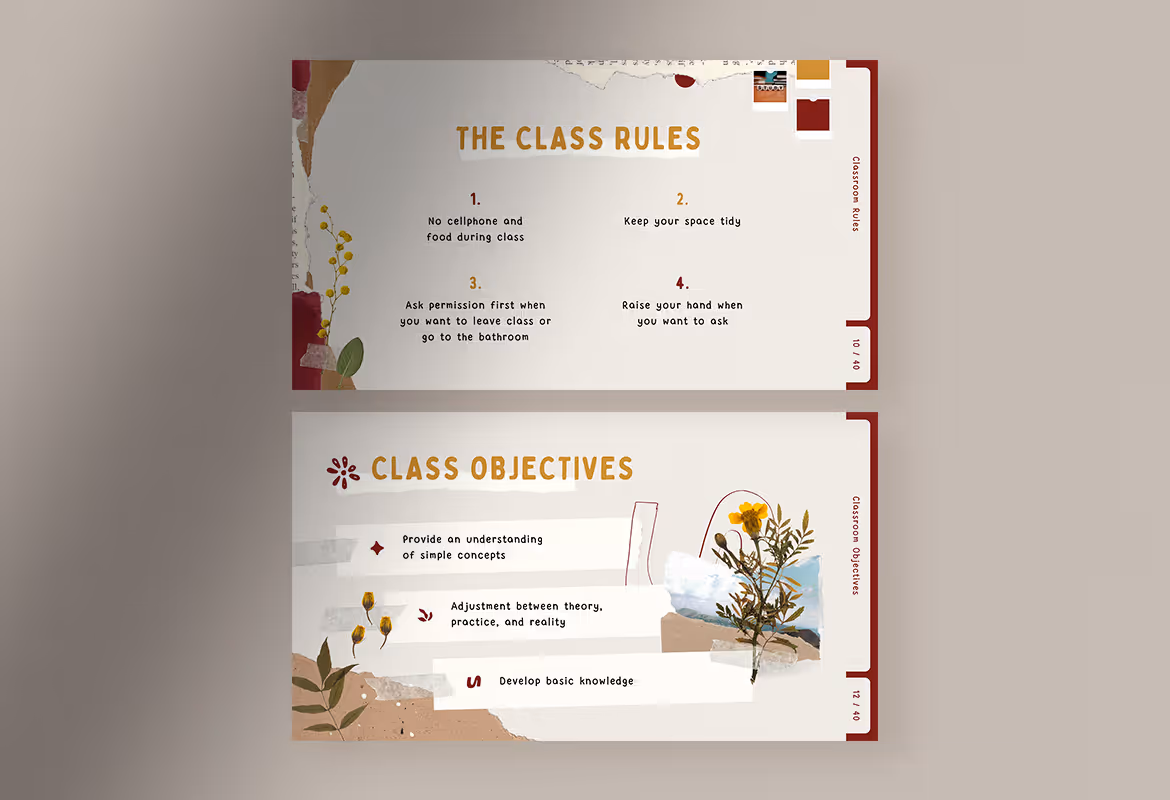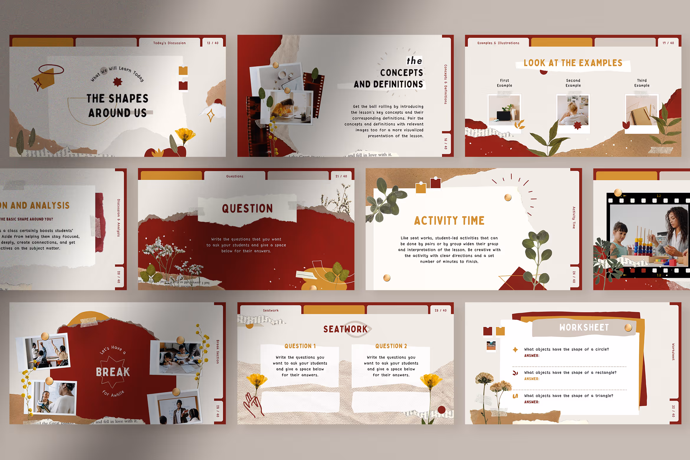 This template has every section you need in presenting your learning materials. Not only providing the discussion session but also the worksheet, sheet work, class activities, and homework section. With this proportional division, you can make your class livelier and more effective in delivering the lesson well. This playful and fun template also can help to boost students’ morale in learning new lessons more eagerly. The scrapbook design with soft background and bold accent makes it more attractive than any other template you used before.