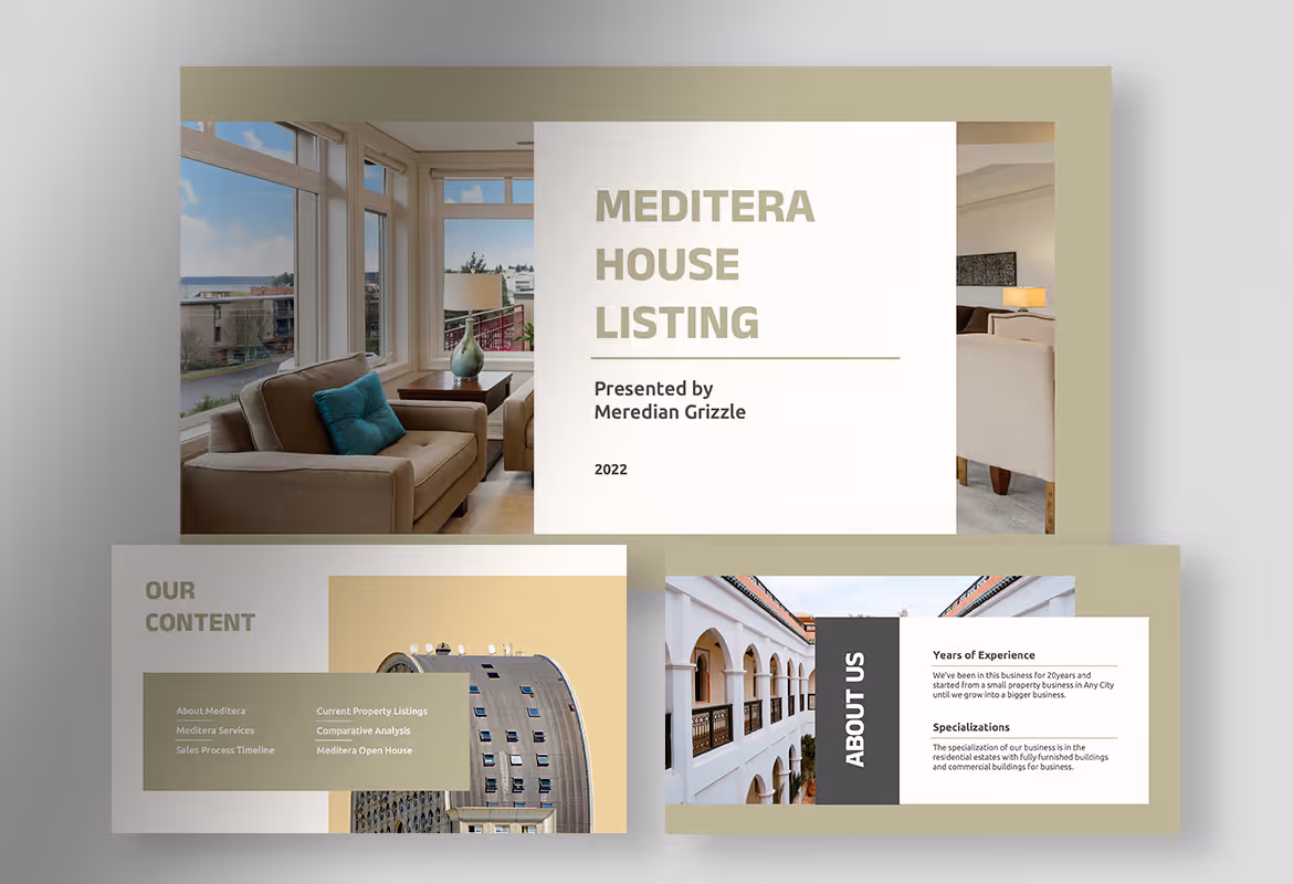 As a real estate agent, to seal the deal with your prospective customer, you have to present something that can’t be denied. A plain and unattractive listing presentation will not be able to get the deal. Although you want to present something simple, you have to make sure that your listing is eye-catching enough to invite the customer’s curiosity. Make your best listing ever using Meditera, the khaki simple real estate listing presentation template.