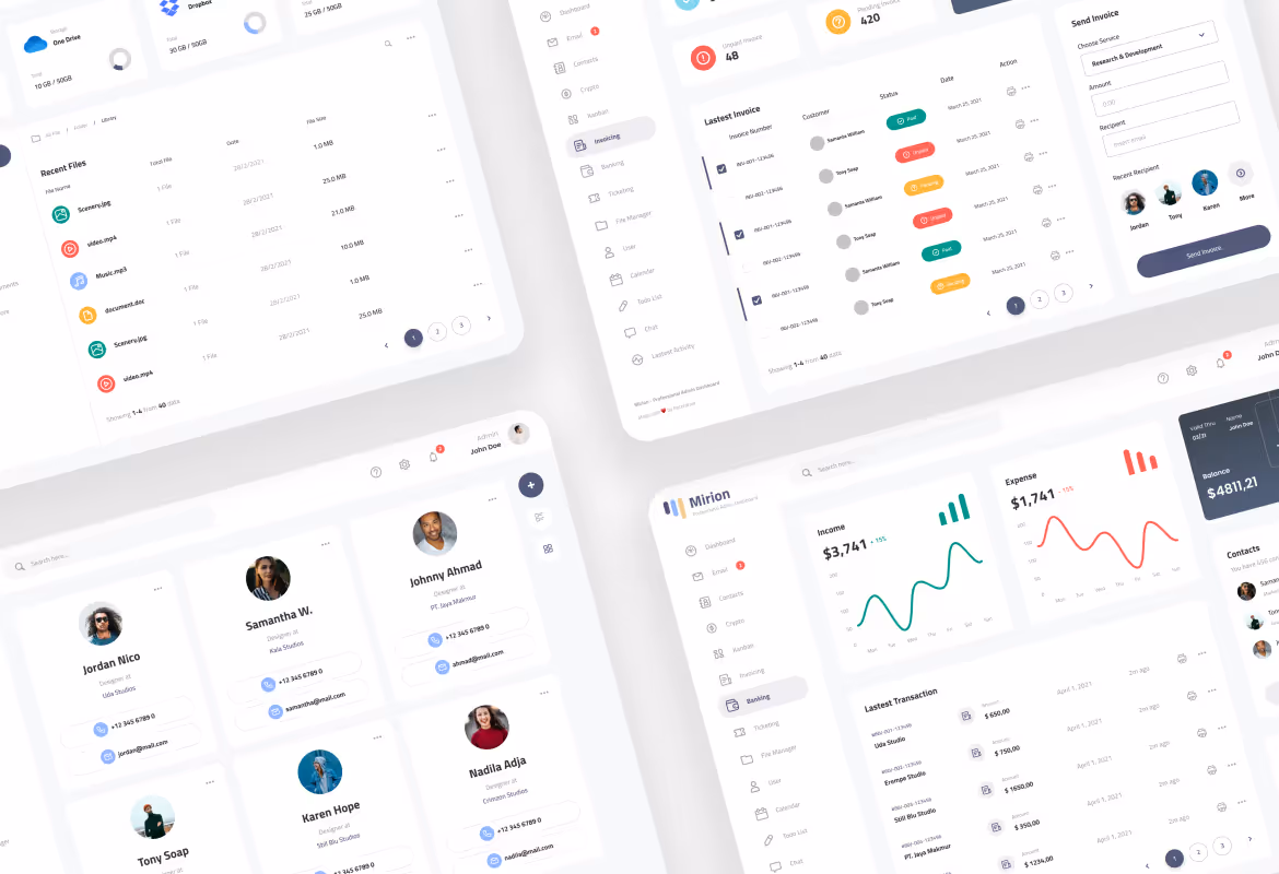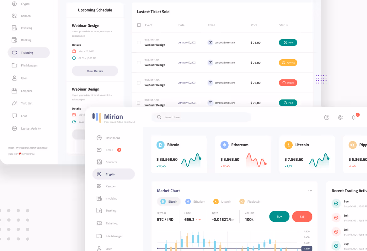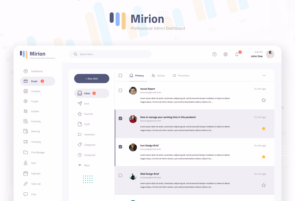 Arranging many projects to be in the right order is part of the admin job. So to make the job of the admin easier you will need the help of Mirion, A Simple Modern Professional Admin Dashboard Template that will be a perfect choice for company admin, project admin, project manager, supervisor, invoice admin, calendar dashboard, Kanban dashboard, and any other admin website.