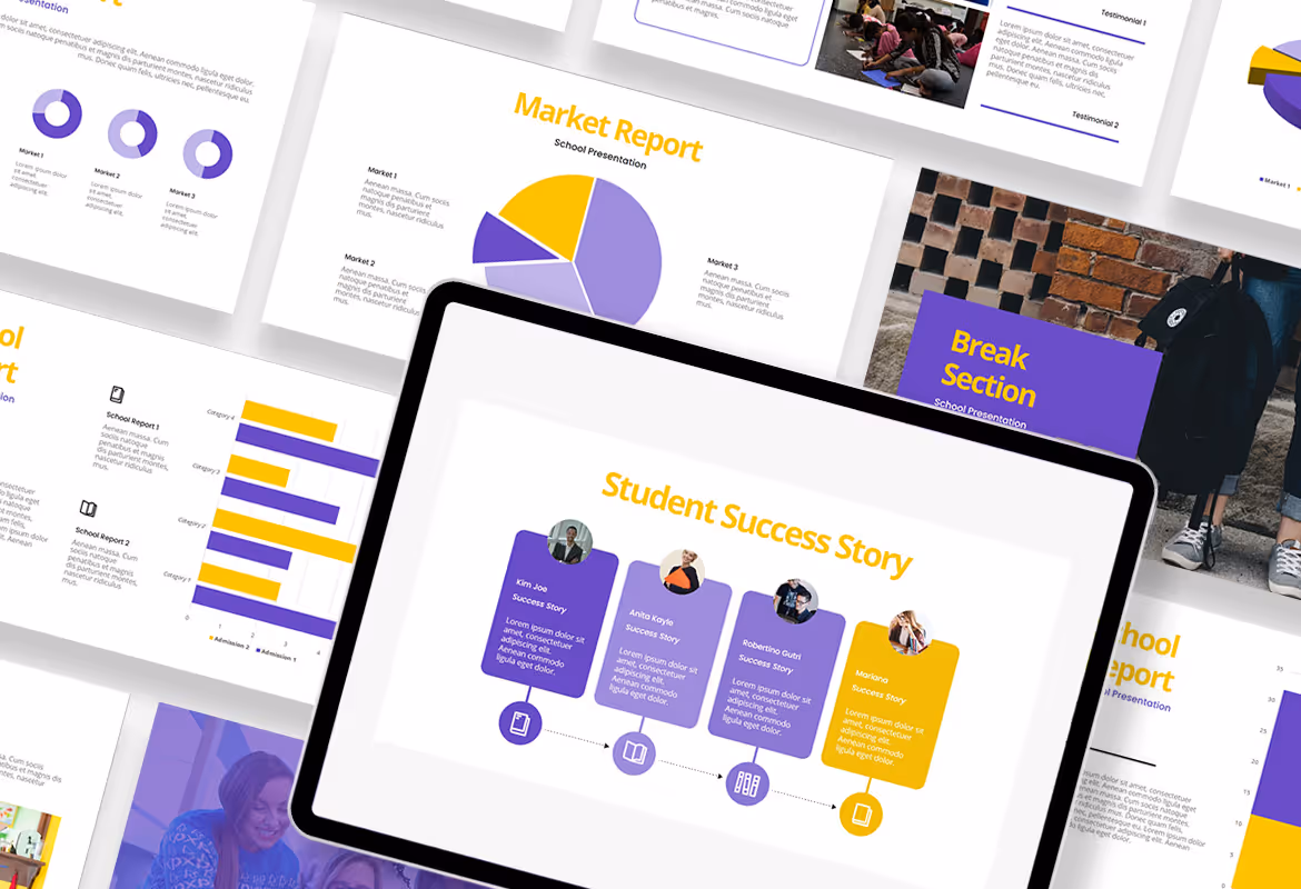 By using purple and yellow as the main colors on every slide, it gives you elegance and modern feels at the same time. The well-organized composition, attractive graphic and proportional layout will help you give a more understandable and gorgeous presentation for your audience.