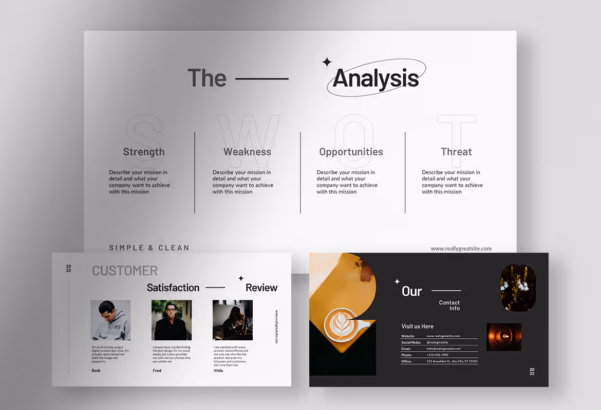 This simple and clean business presentation template has a monochrome nuance with black, white and grey color that will help you make a professional and modern presentation. It has a well-organized layout and proportional composition and space so you can put all the necessary information on this template.