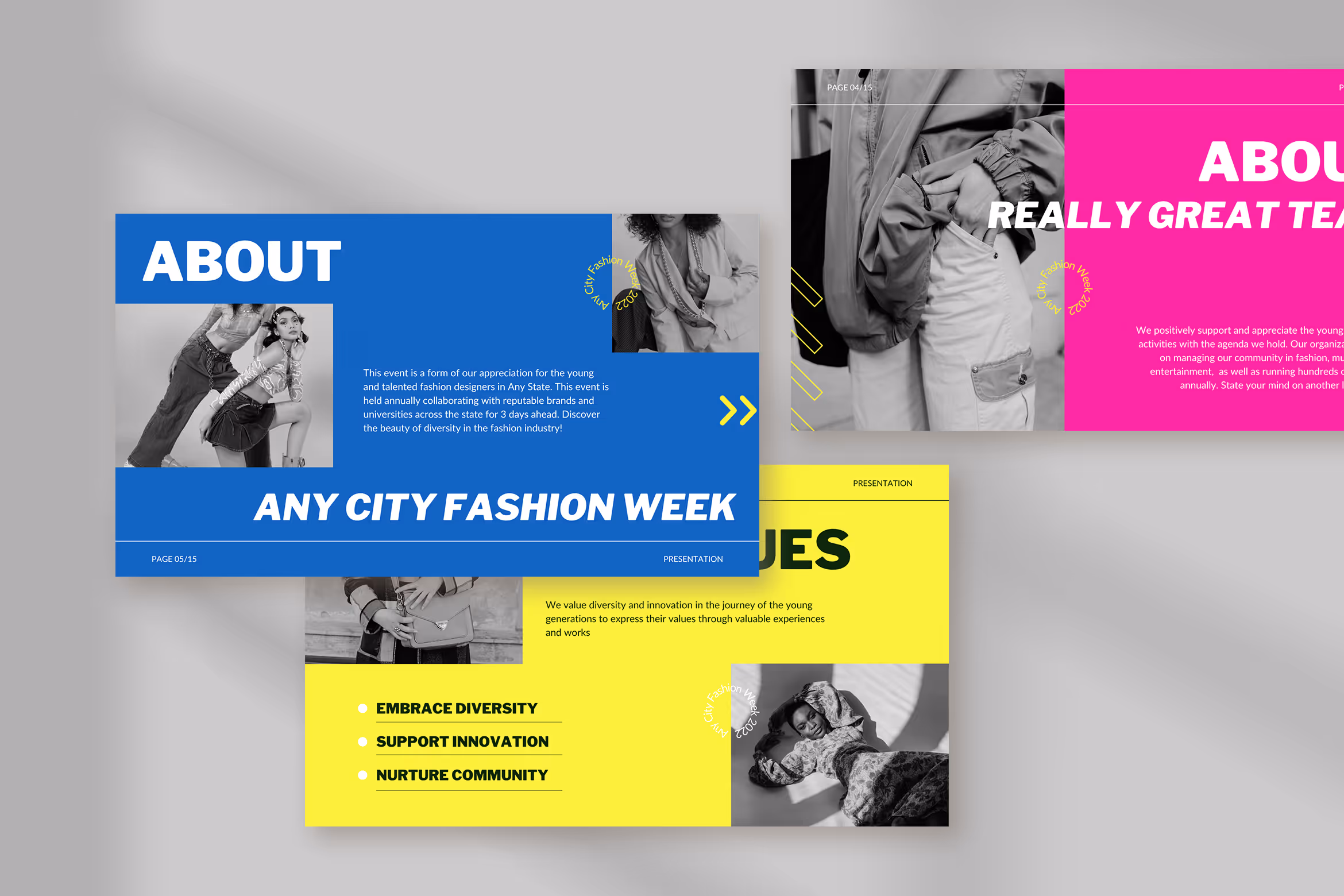 No one will avert their gaze once they saw this presentation since its neon color will strike the field of their vision. It is combined with the grayscale and black & white image that create an outstanding look. Besides, it has a well-organized layout that can accommodate all the key points you need to deliver. This template is perfect for any event, especially for fashion, music, or other performances.