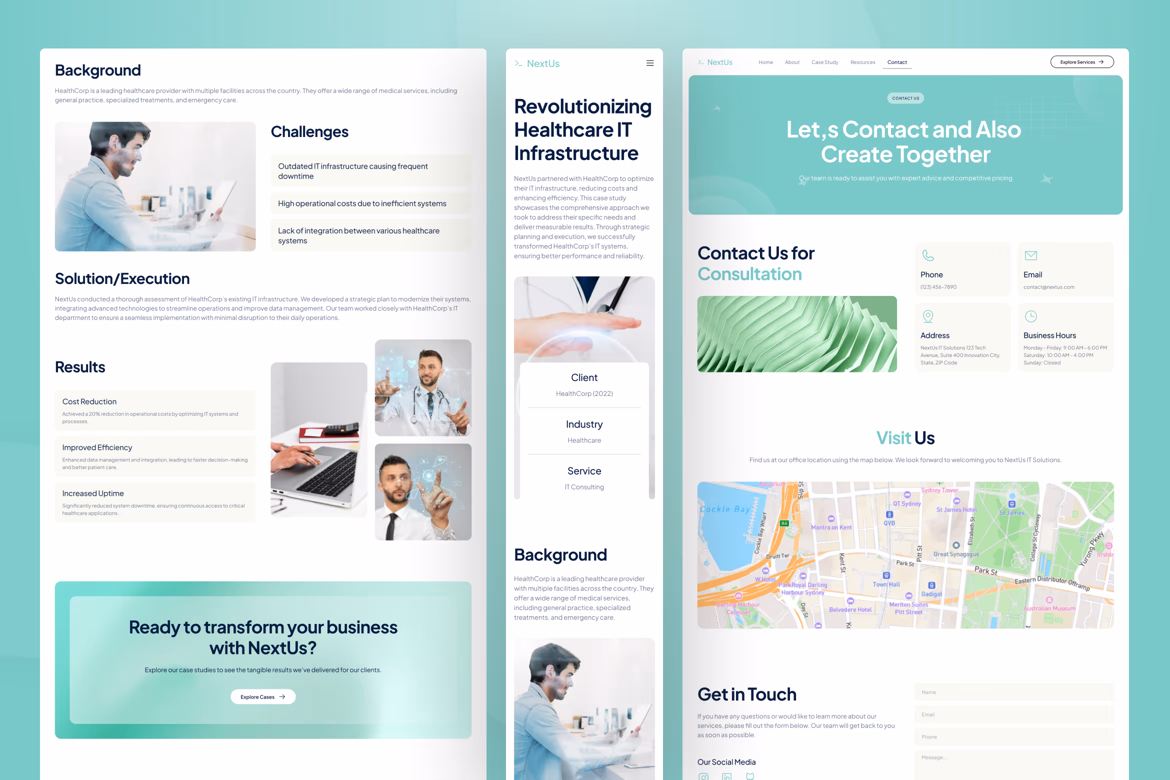 Bring the sophistication of your IT services to your business website using NextUs, a simple modern IT solution website UI Figma template. This template has a light and clear vibe from the combination of green and tile elements and accents. The simple layout on every page and section makes the website easy to explore. Also, each section boundary is clean, so the information provided is readable and easy to understand. Transform your website using this template for a better look and engagement.