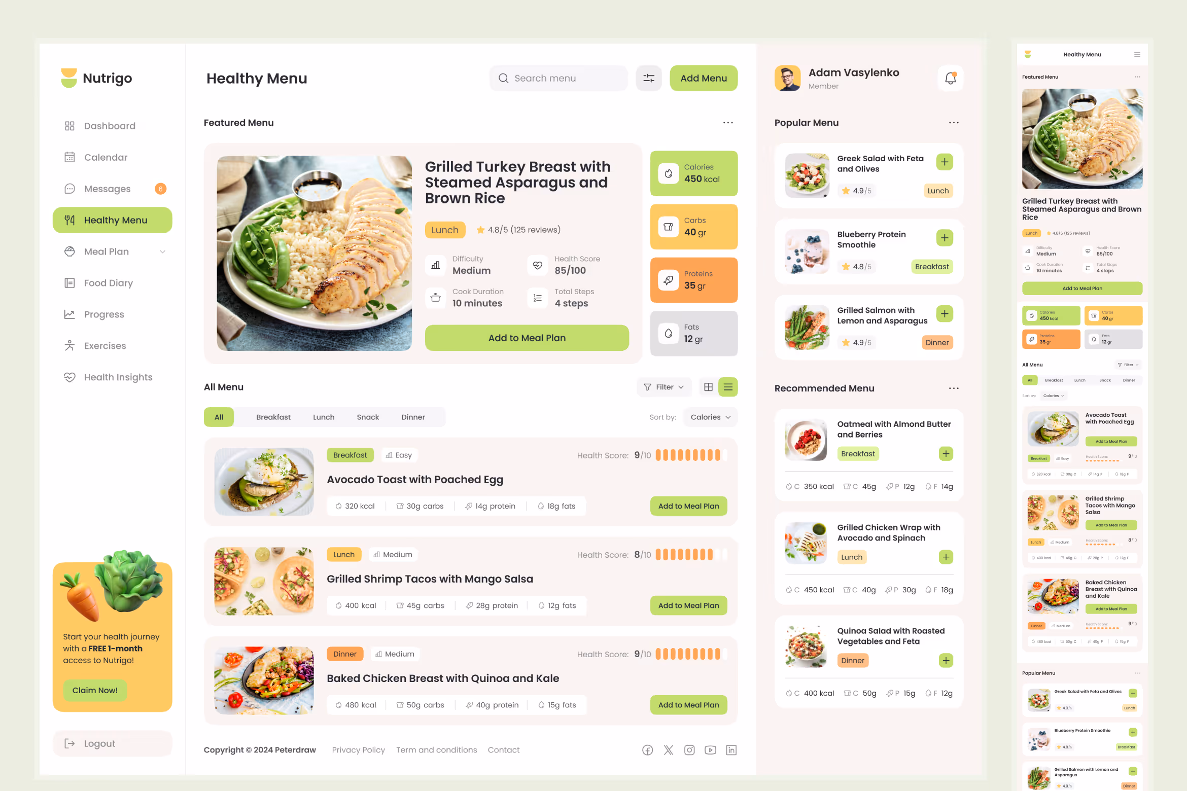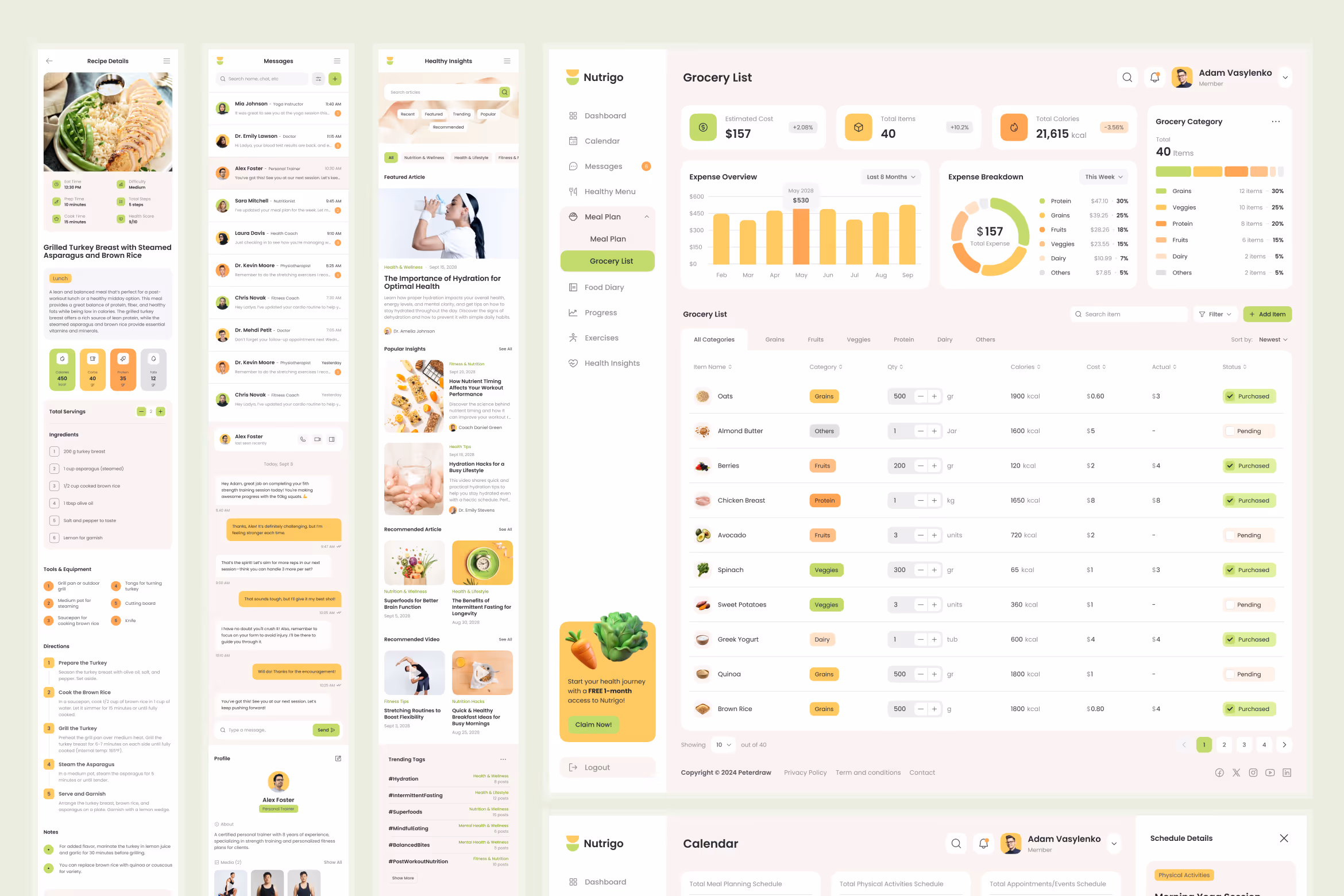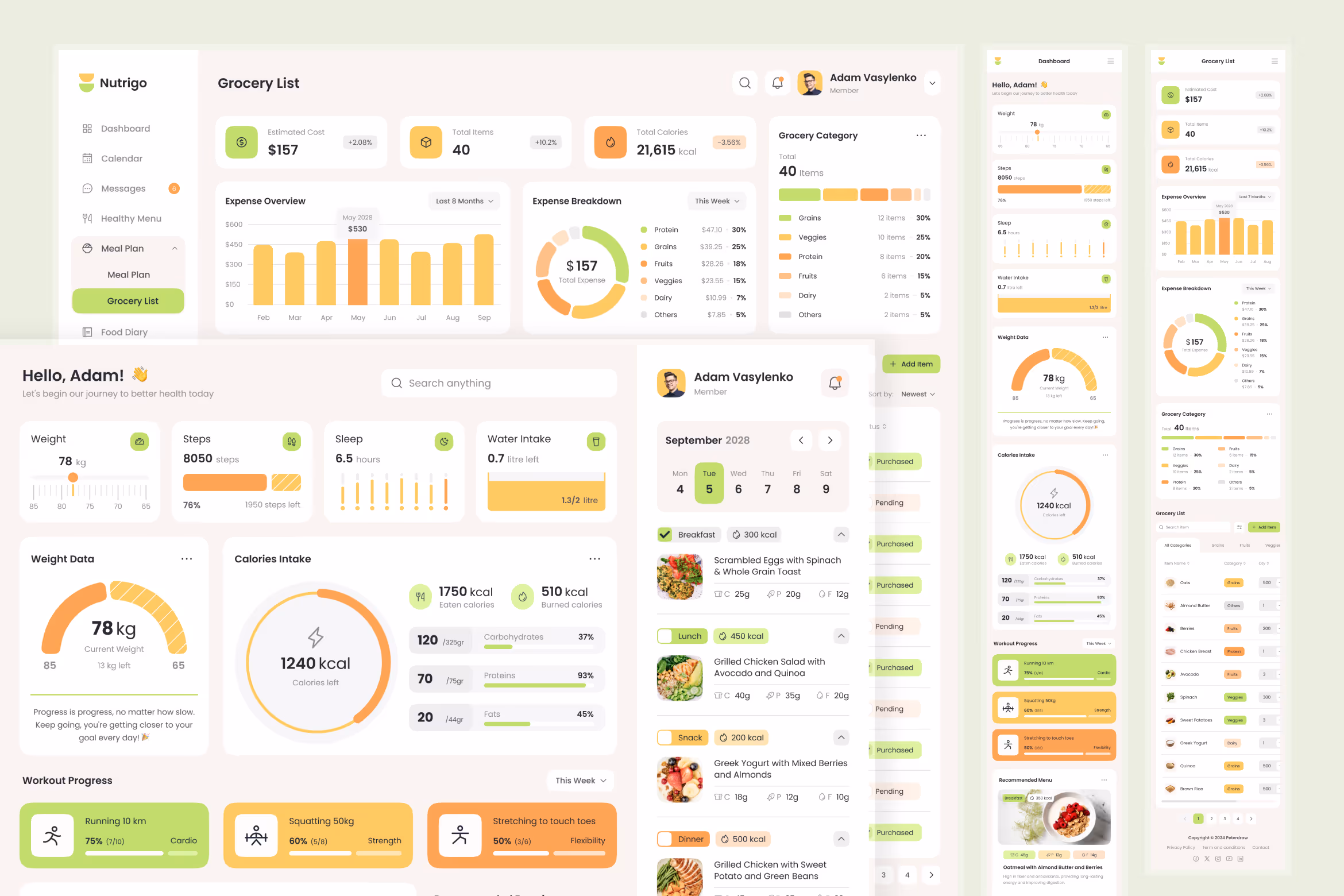 Provide an appealing and comfortable diet dashboard for users using Nutrigo, a bright and energic nutrition and diet dashboard Figma template. The combination of yellow, green, and orange, brings the energetic vibe to the dashboard. Furthermore, it is the combo of veggies colors that is very suitable for nutrition and diet themes. Each page and section has a well-organized layout. So that all the info in the dashboard can be understood easily. Plus, it has various graphics and charts that provide data on your diet and health progress. This template is perfect to boost the spirit of healthy living.