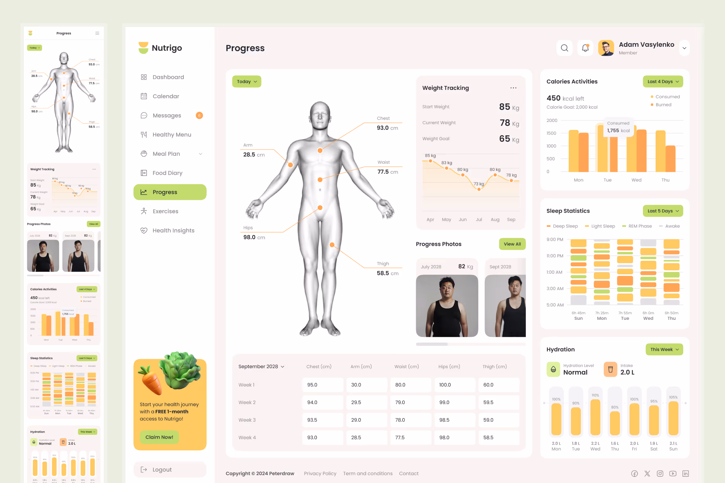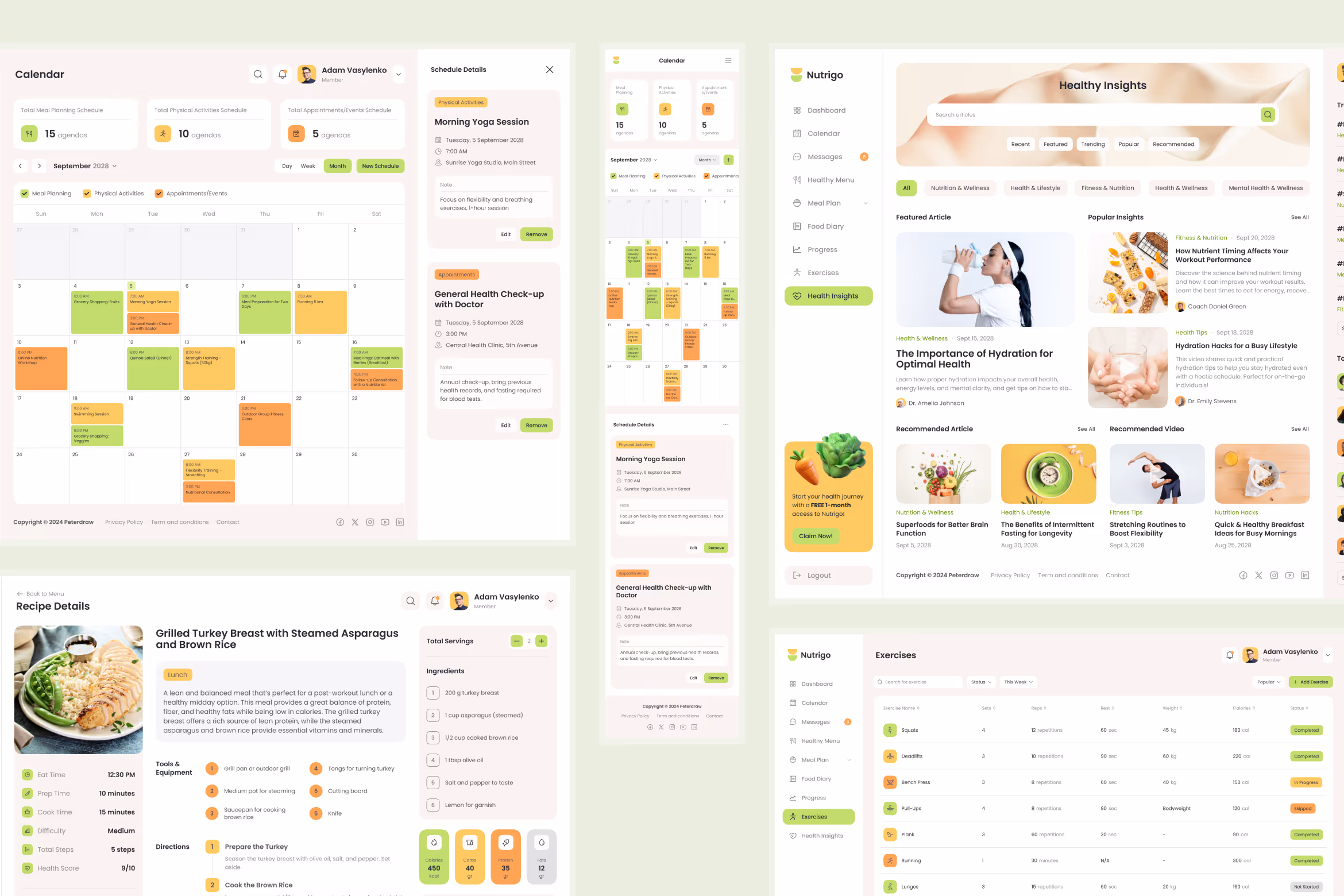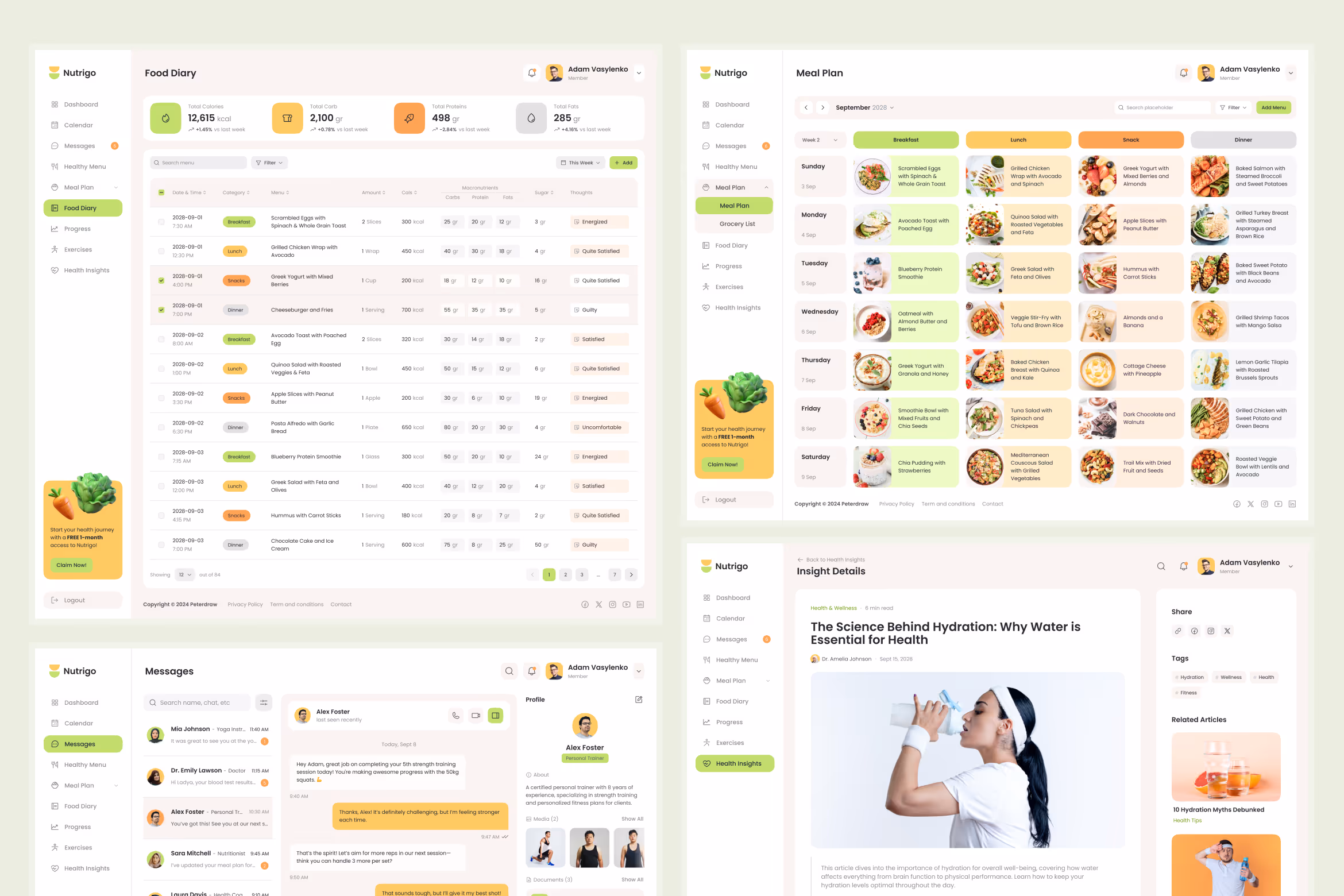 Provide an appealing and comfortable diet dashboard for users using Nutrigo, a bright and energic nutrition and diet dashboard Figma template. The combination of yellow, green, and orange, brings the energetic vibe to the dashboard. Furthermore, it is the combo of veggies colors that is very suitable for nutrition and diet themes. Each page and section has a well-organized layout. So that all the info in the dashboard can be understood easily. Plus, it has various graphics and charts that provide data on your diet and health progress. This template is perfect to boost the spirit of healthy living.