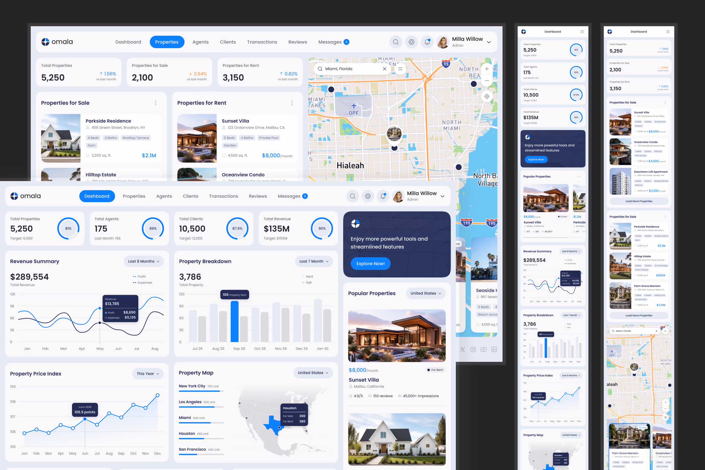 Looking for a sleek and efficient way to manage real estate operations? Omala, an intuitive and modern dashboard template, is the perfect solution. This template is designed to streamline property management for agencies, realtors, and property firms. Available in desktop, tablet, and mobile views, it offers a seamless user experience across all devices ensuring efficient property and client management.