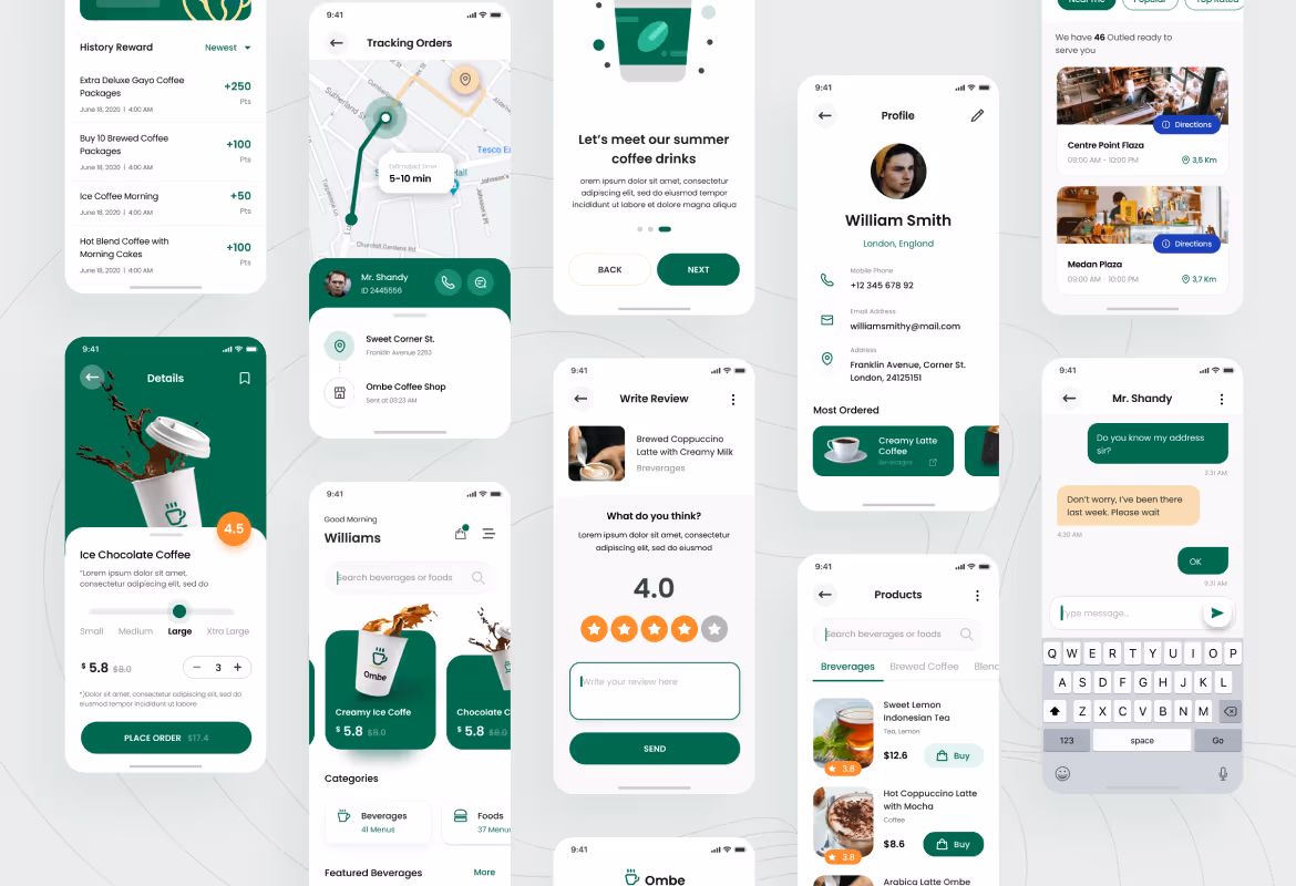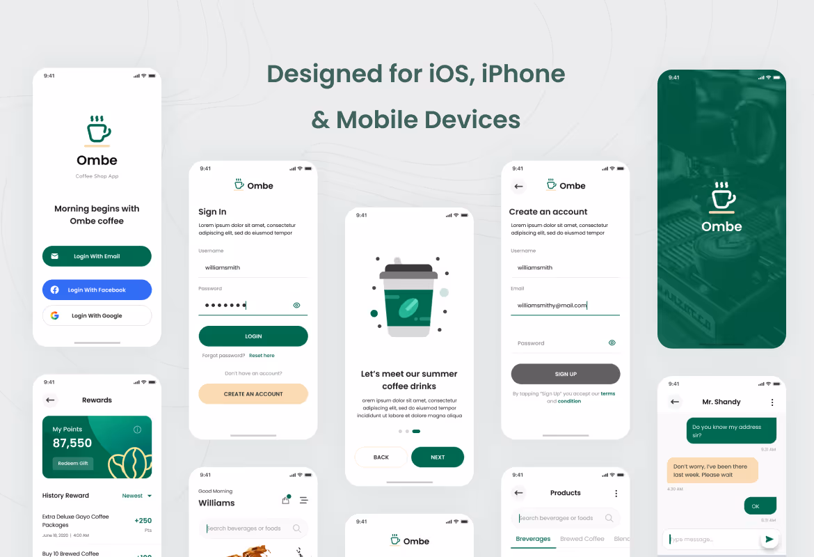 Modern iOS User Interface design template for a Coffee shop app. This template is ideal for a Caffe, coffee order, coffee delivery app, beverages app, and any coffee shop app. Make your app design looks stunning and eye-catching using this template. This template includes 15 unique and modern User Interface screens in PSD and Figma format. You can edit and customize easily using Adobe Photoshop and Figma.