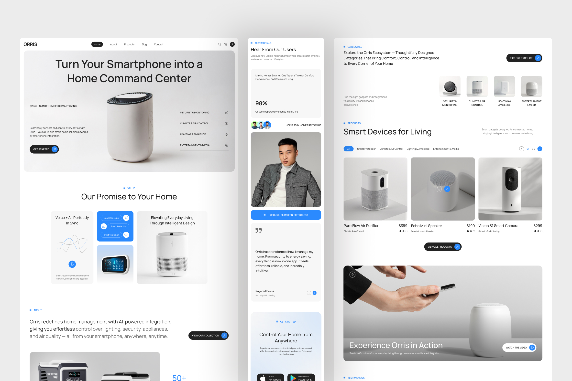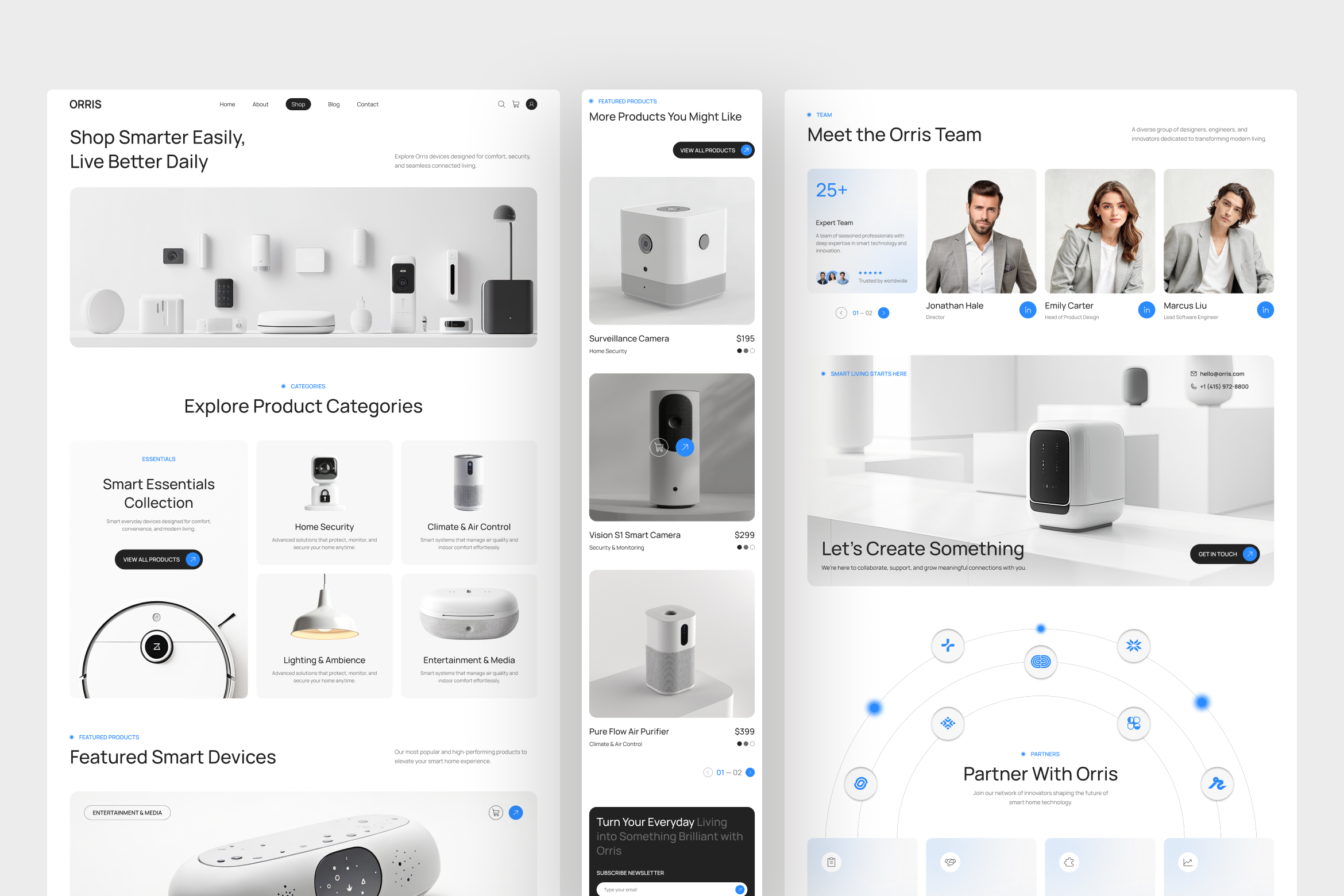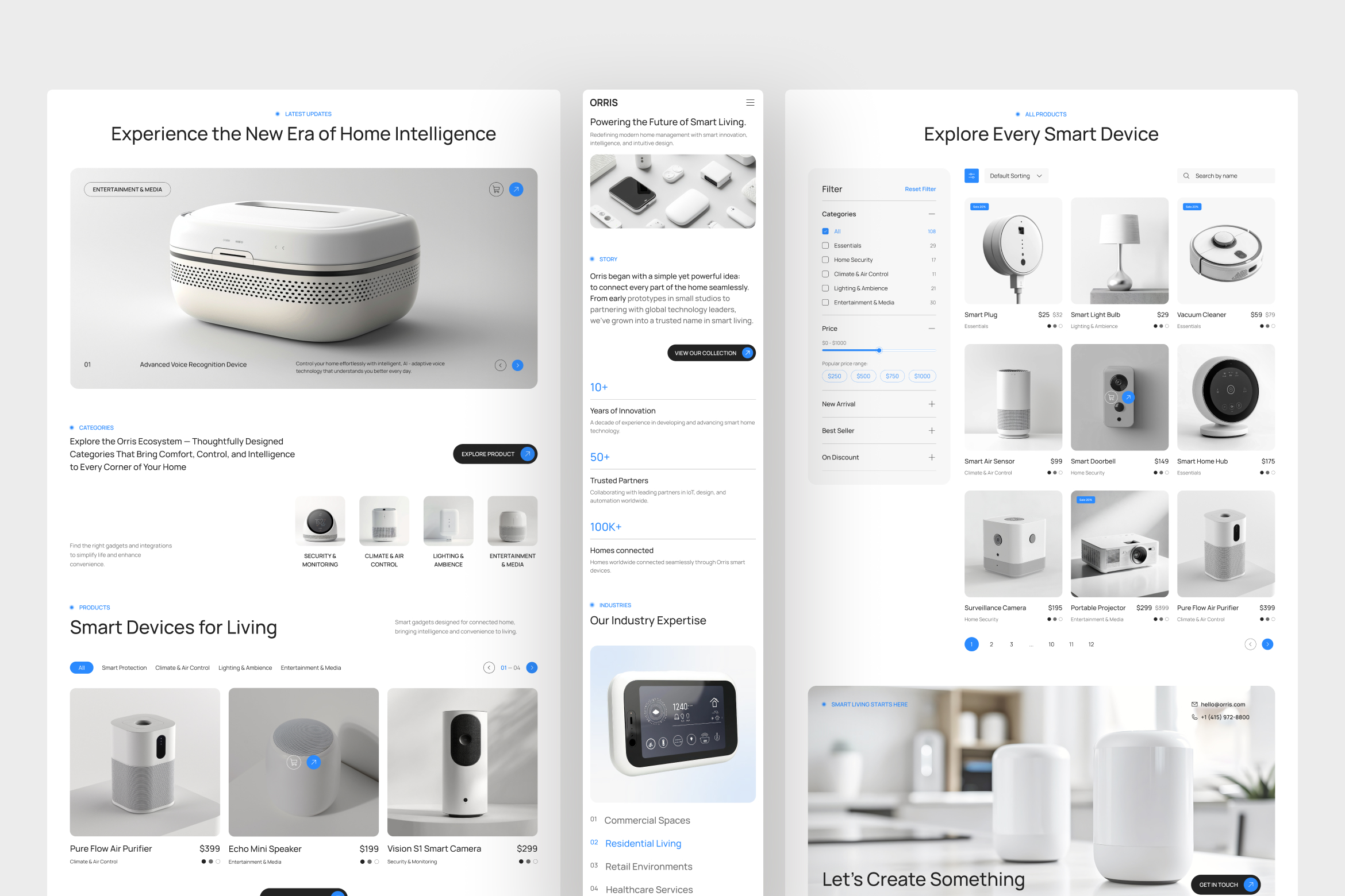 Orris blends minimal structure with smart device imagery to create a calm, high-tech shopping experience: