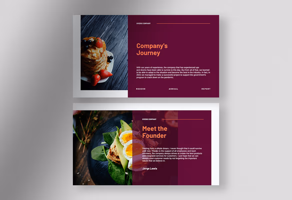 The growth of a company needs to be evaluated regularly. It is aimed to control whether or not your company grows healthily with impressive progress. Therefore, an annual report is usually used to be a CEO’s calling card for high-level discussion to decide the next step. If you are looking for an attractive modern presentation template that can portray your company’s professionalism, Overix, can be the best option for you.