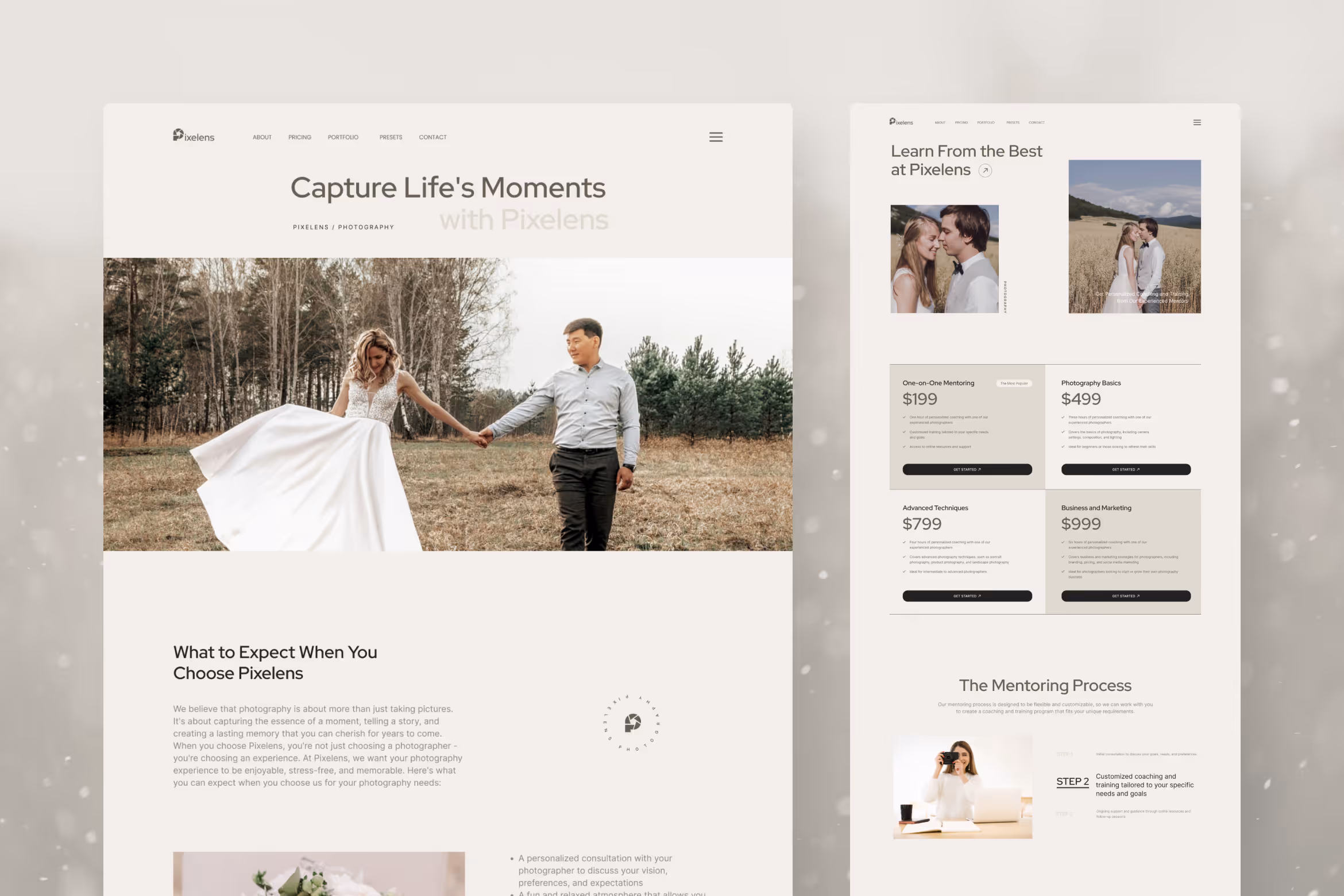Using neutral beige for the main background color and black for the text makes this minimalist template looks elegant. Its simple layout can help the website visitors focus more on the photographs and other important information. In this layout, you can get up to three homepage variations, along with about us, portfolio, project detail, pricing, travel schedule, experience, education, preset and contact page. All of them have a simple user interface design that will allow anyone to use it easily. Get the best look you can have to attract more clients using this template.