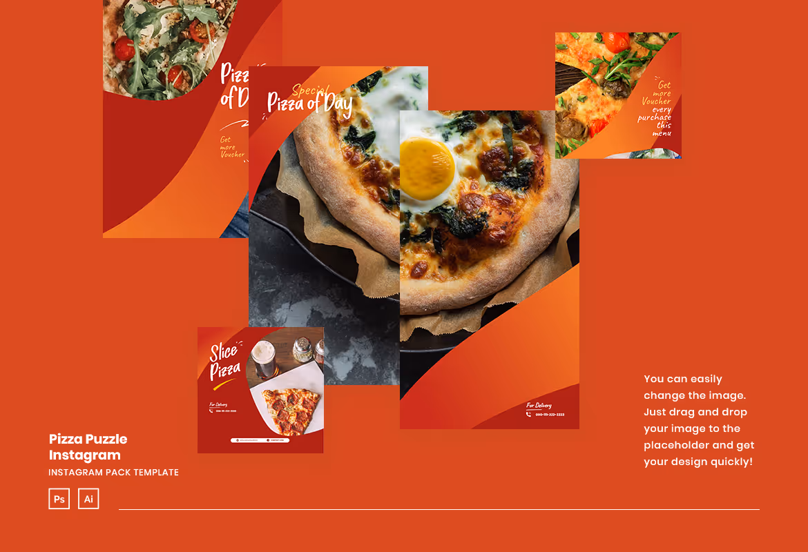 Pizza Instagram ads post and story template with a puzzle style. This template is ideal for Pizza, Fast food, Burger shop, and any food theme. Make your Instagram promotion looks stunning and eye-catching using this template. This template includes 12 unique and cool Instagram posts and Story templates in PSD and AI format. You can edit and customize easily using Adobe Photoshop and Adobe Illustrator.