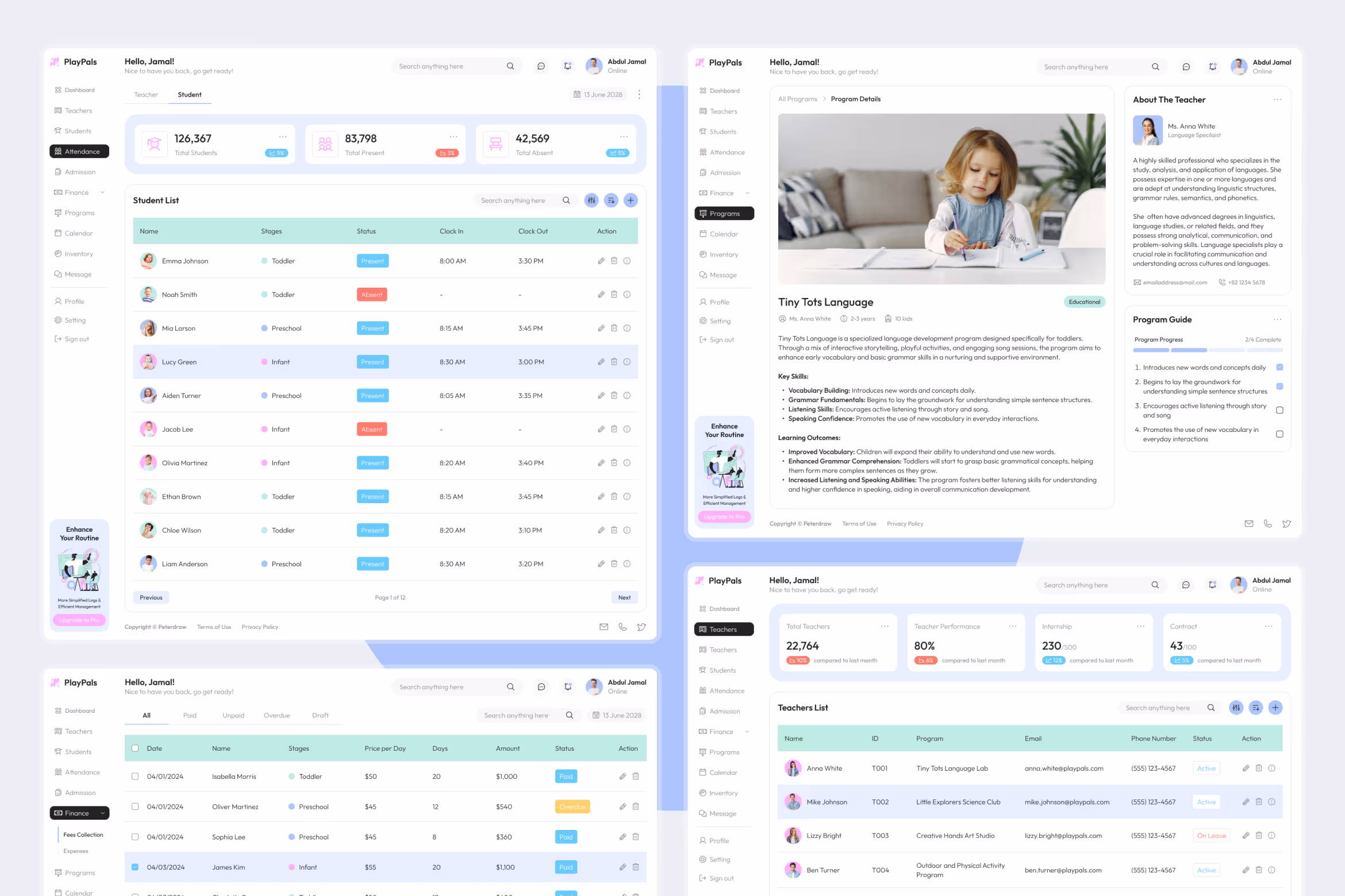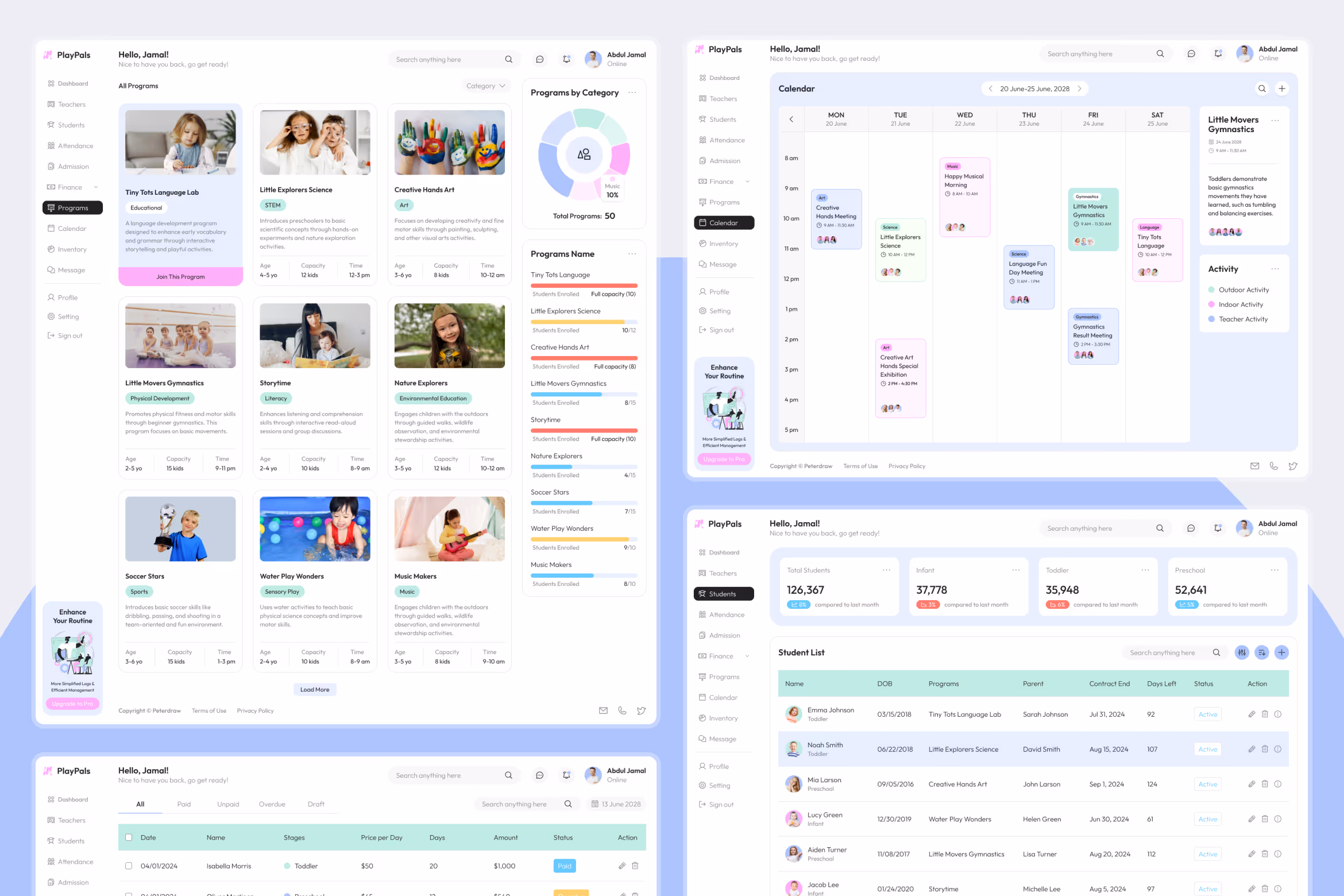 Organize all the data of students and teachers and work better to maintain and monitor them using PlayPals, a simple playful daycare dashboard Figma template. The simple layout this template offers allows any user to use it easily. The combination of bright colors as an accent makes this template look cheerful. This template is perfect for any daycare with a cheerful and playful vibe like the happy kids.