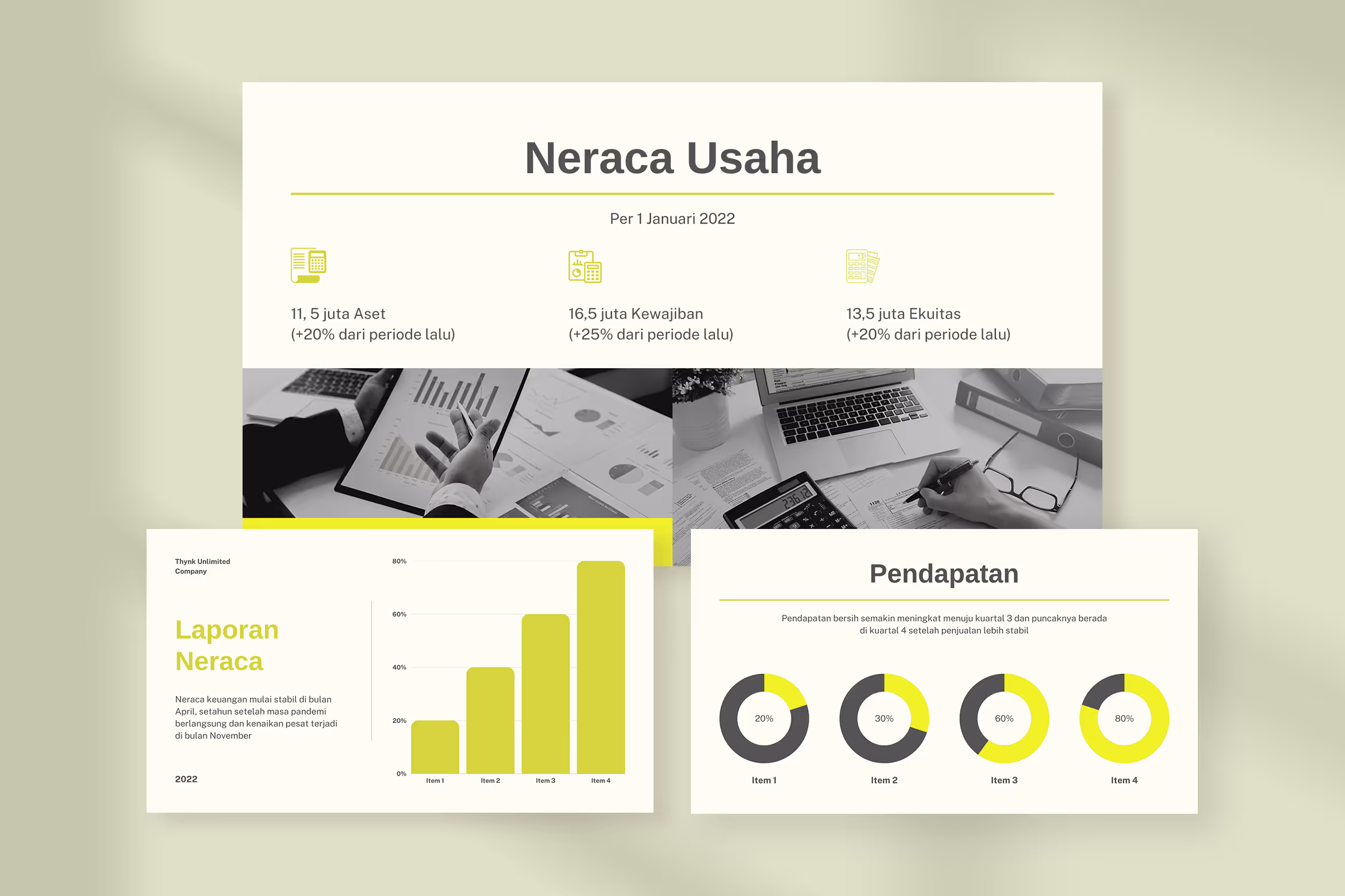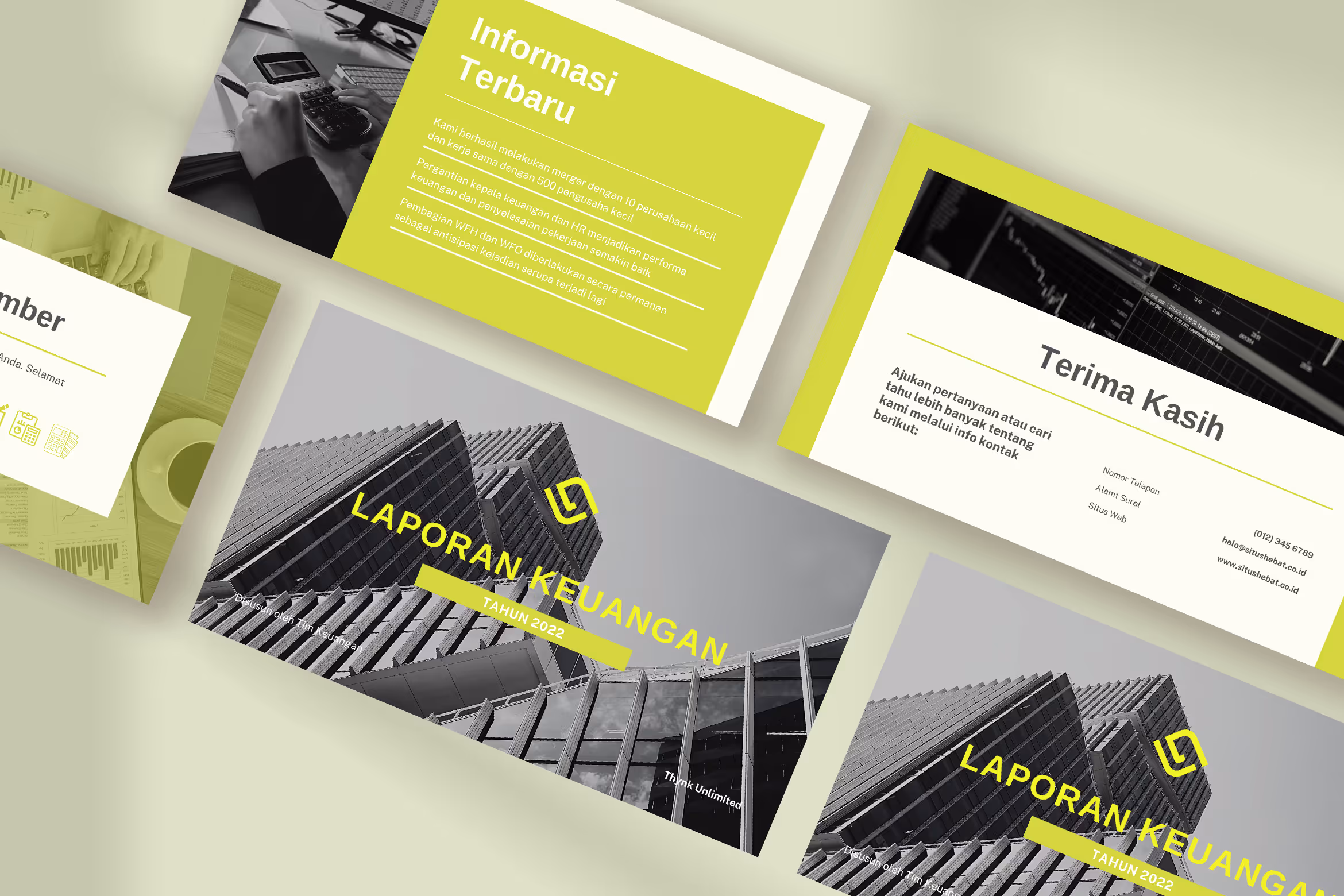 This template has everything you need to report your quartal or yearly financial report. It provides you with not only proportional space for your statements but also various charts to support your explanation and report. The bright lemon color on this template is a great contrast to the grayscale background and image that will make your presentation more outstanding. Although it contains Indonesian content, you can adjust the content to your needs. You can apply this template to any financial report in your company or business you manage.