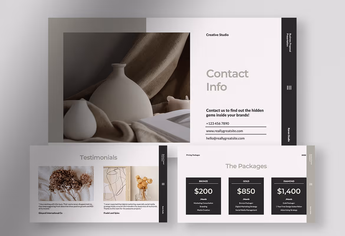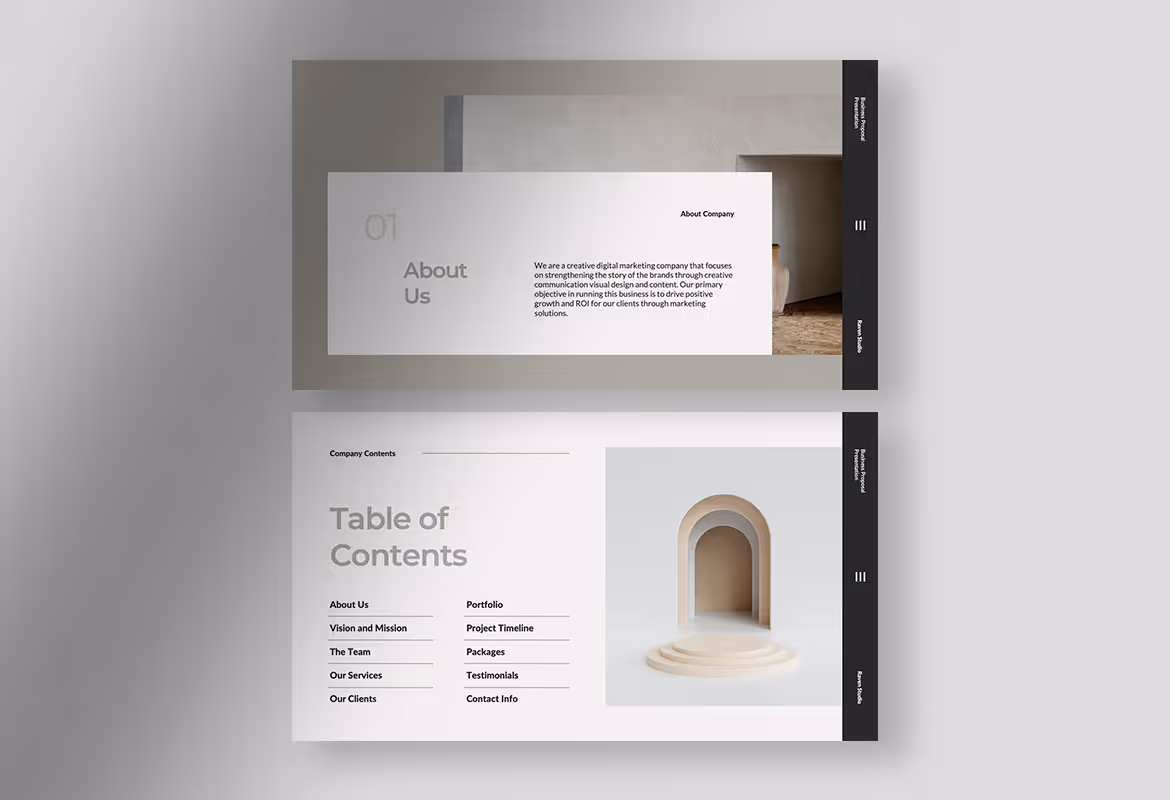 This template is specially designed to help you deliver your presentation in the most professional and presentable way. Adopting a minimalist concept, this template has an interesting color combination and proportional layout that creates luxury and professional image. Furthermore, this template also has comprehensive content that can carry your ideas. You can add essential information regarding your plans such as your services, portfolio, and estimated timeline. Lock the attention of your audience with this attractive template at the first glance.
