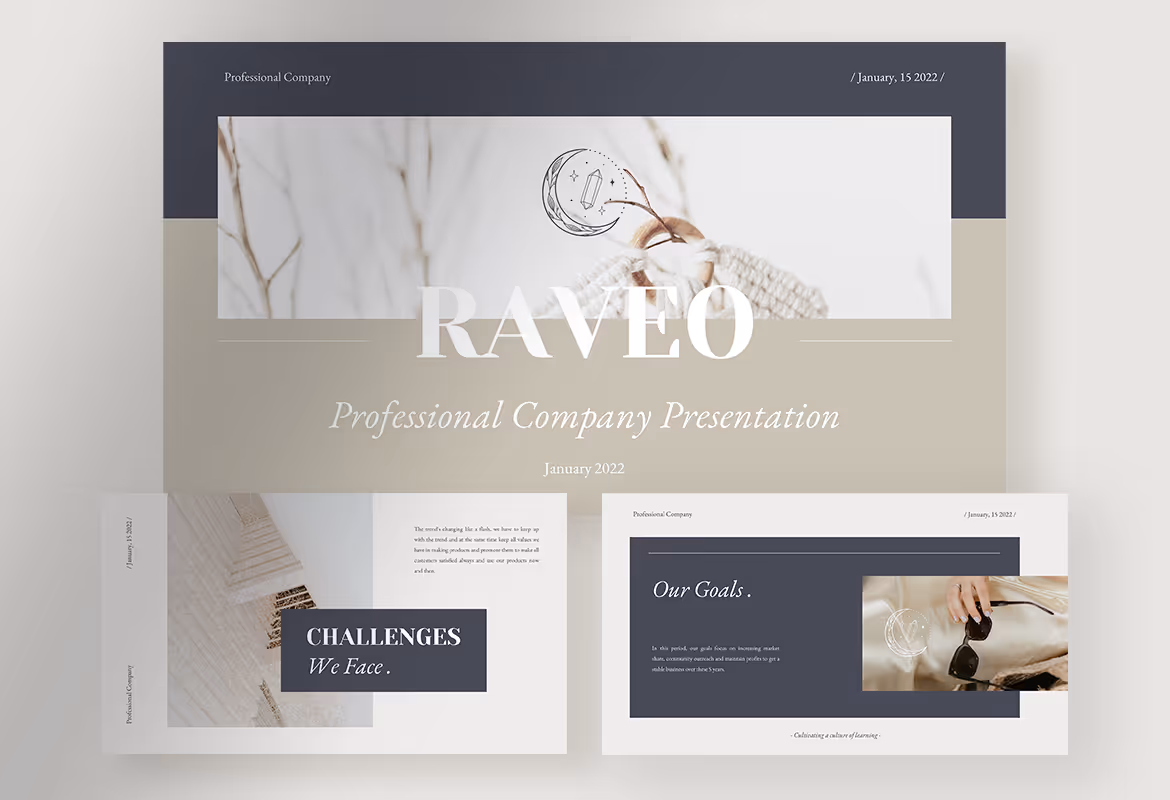 To get the best result from your company presentation, you have to offer what you have and you can to your partners, clients, or customers. Whether for your promotion or cooperation purposes, showing your best qualities is a must to gain success. You will need a proper and suitable template to create your best company presentation, like our latest item template, Raveo, an elegant professional company presentation template. You can create a company profile, marketing kit, business offer or any other company presentation using this template.