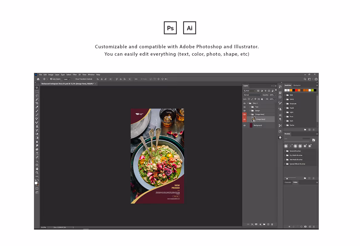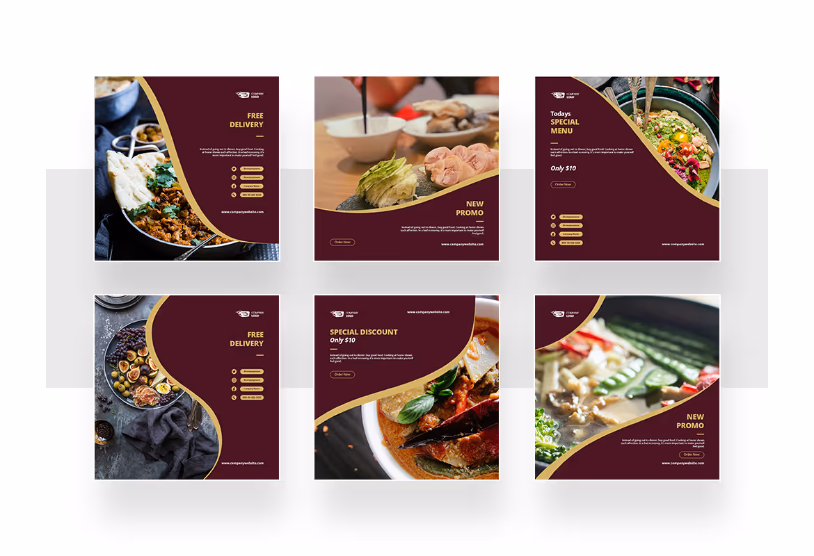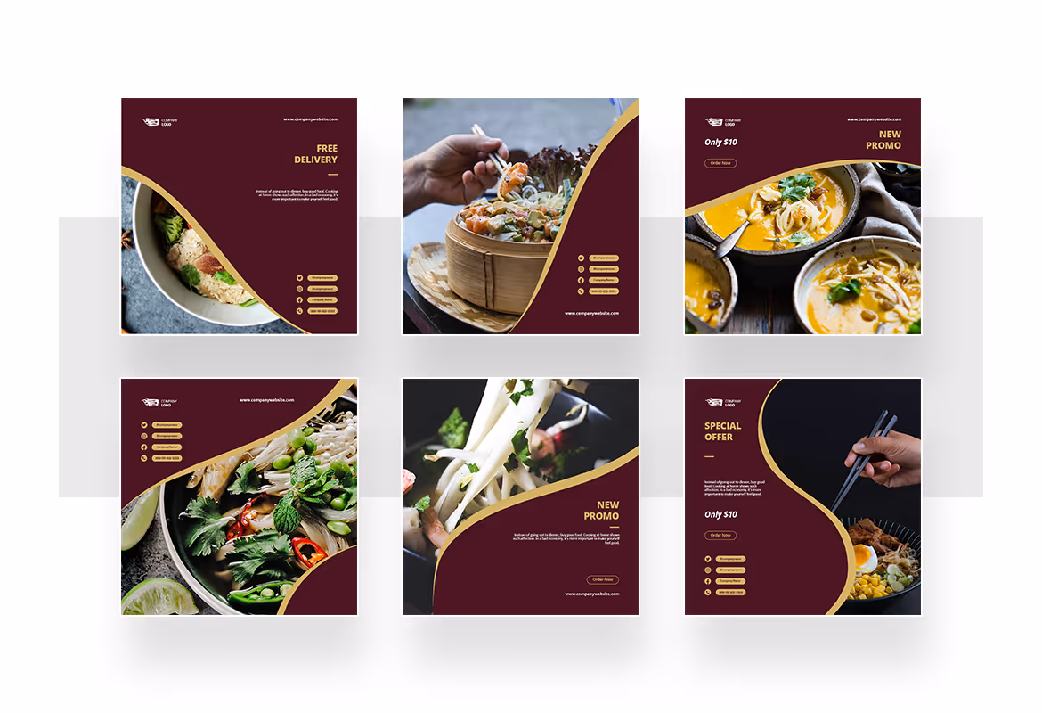 Restaurant Instagram ads post and story template with a modern and elegant style. This template is ideal for restaurants, hotel, healthy food, food delivery, vegetable, and any food theme. Make your Instagram promotion looks stunning and eye-catching using this template. This template includes 12 unique and cool Instagram posts and Story templates in PSD and AI format. You can edit and customize easily using Adobe Photoshop and Adobe Illustrator.