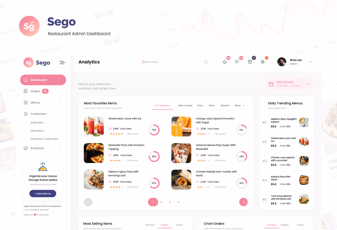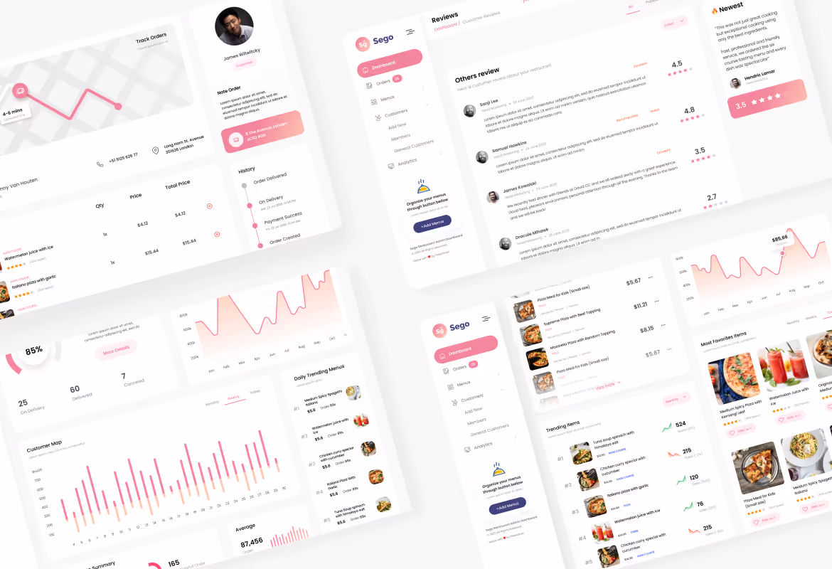 Modern dashboard User Interface design template for a Restaurant Food delivery. This template is ideal for a Restaurant, Food order, Food delivery, Fast food order, and any admin dashboard website. Make your admin dashboard design looks stunning and eye-catching using this template. This template includes 6 unique and modern User Interface screens in PSD and Figma format. You can easily edit and customize using Adobe Photoshop and Figma.