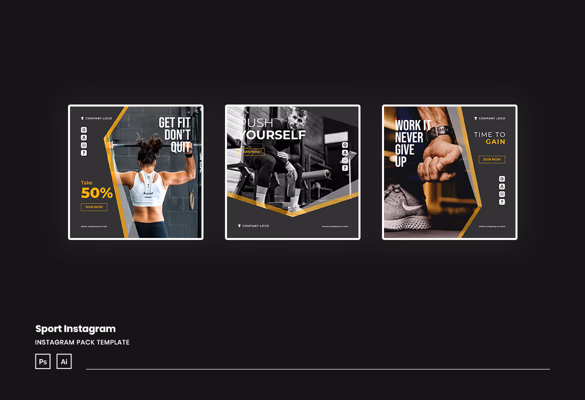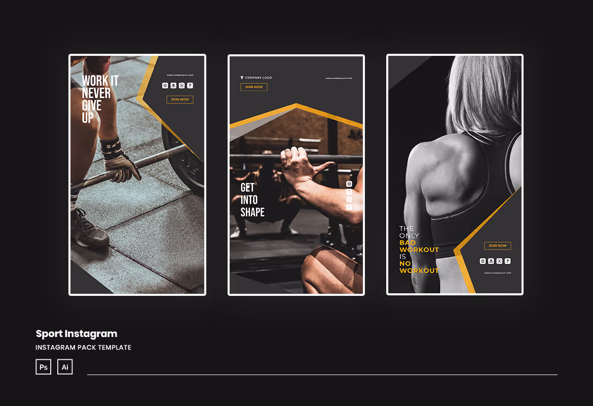 Sports Instagram story and post template with a modern theme. This template is ideal for Sport, Fitness, Healthy, Training, Diet Program, and more. Make your Instagram promotion looks stunning and eye-catching using this template. This template includes 12 unique and cool Instagram posts and Story templates in PSD and AI format. You can edit and customize easily using Adobe Photoshop and Adobe Illustrator.