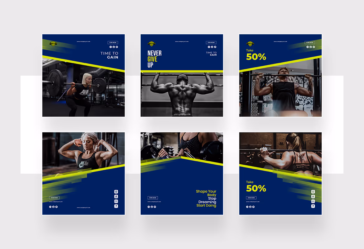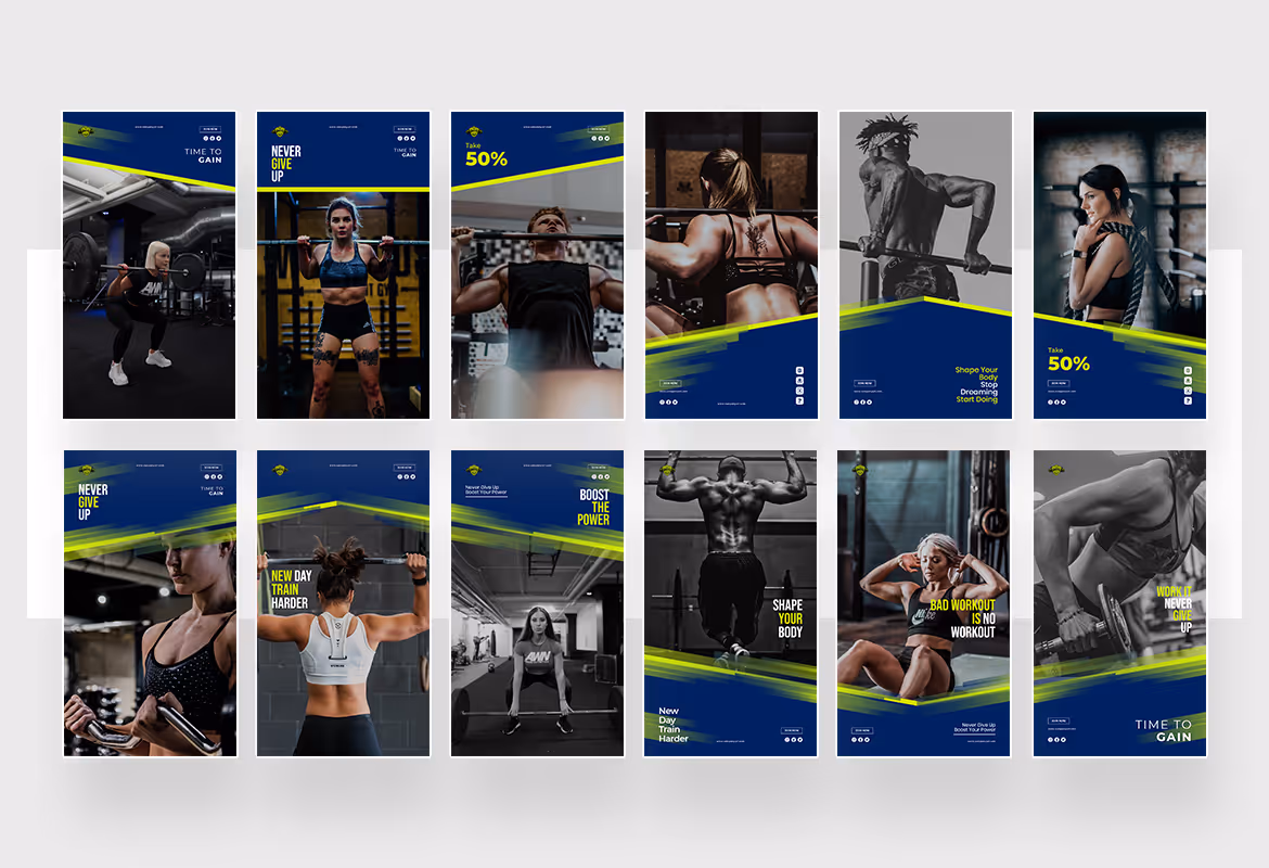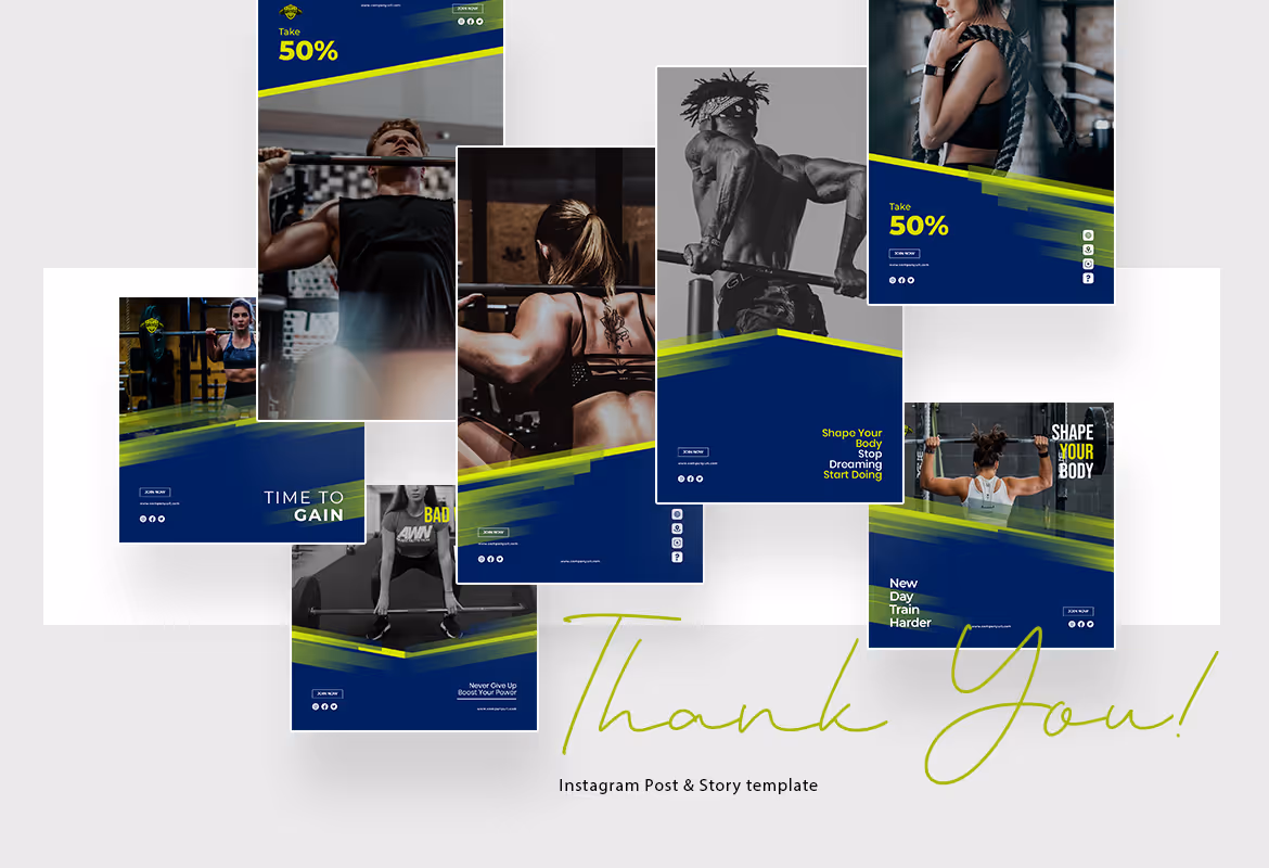 Sports Instagram story and post template with a modern theme. This template is ideal for Sport, Fitness, Healthy, Training, Diet Program, and more. Make your Instagram promotion looks stunning and eye-catching using this template. This template includes 12 unique and cool Instagram posts and Story templates in PSD and AI format. You can edit and customize easily using Adobe Photoshop and Adobe Illustrator.