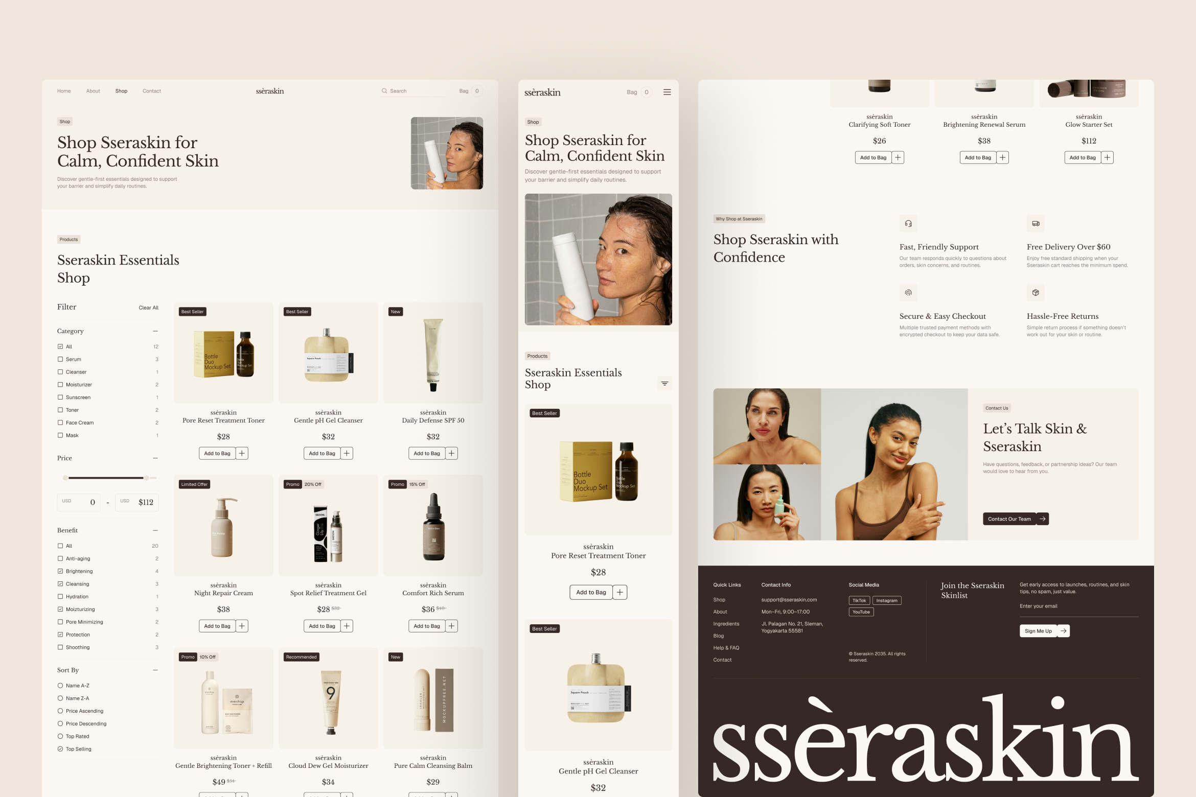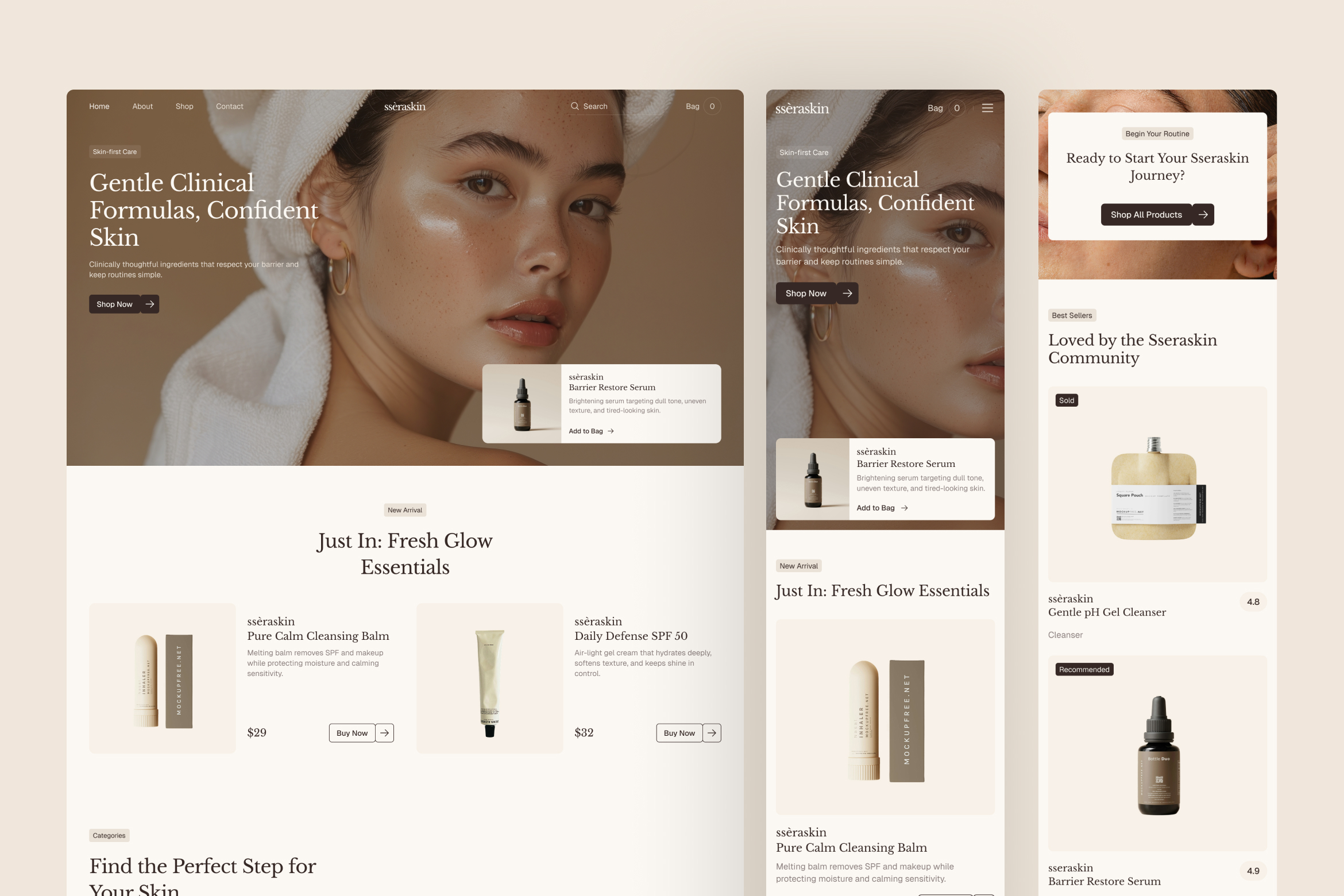 Sseraskin uses a warm, minimalist layout system with strong hierarchy and product-forward storytelling to keep the experience modern and soothing: