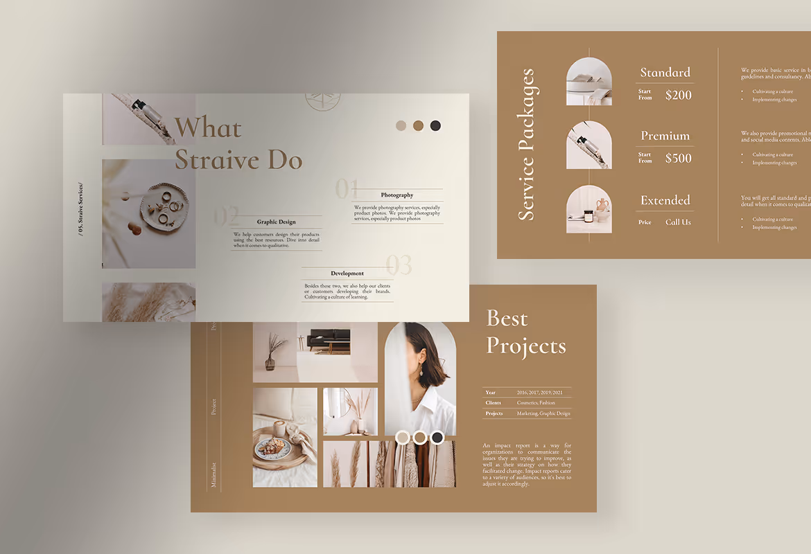 Straive, a peanut butter minimalist project proposal presentation template, provides you with 10 unique template designs, available in PPT and PPTX format files. You can edit the text, image, and color on the template using Microsoft PowerPoint or any other compatible application on your device to be more like your preferences or needs.