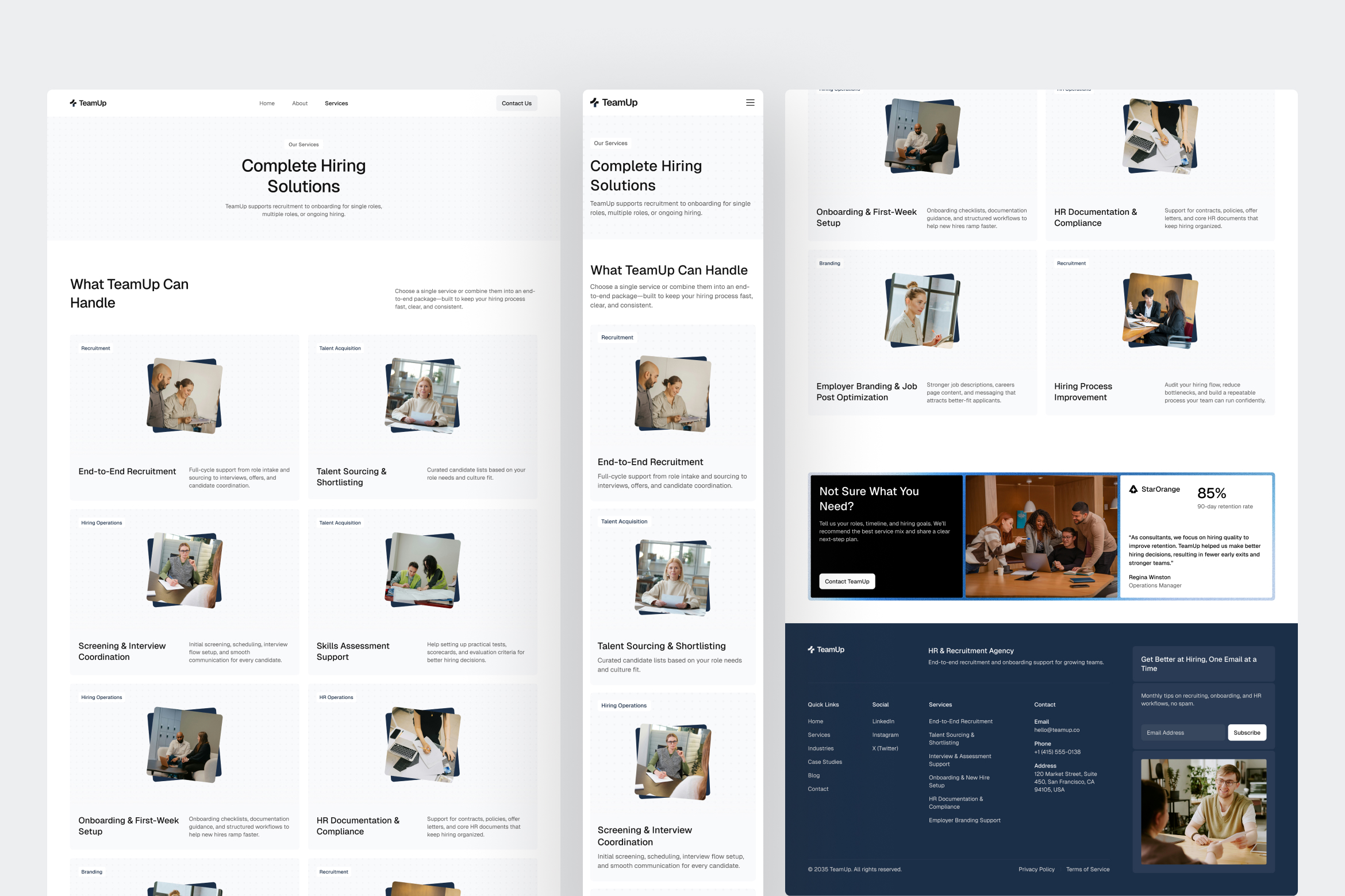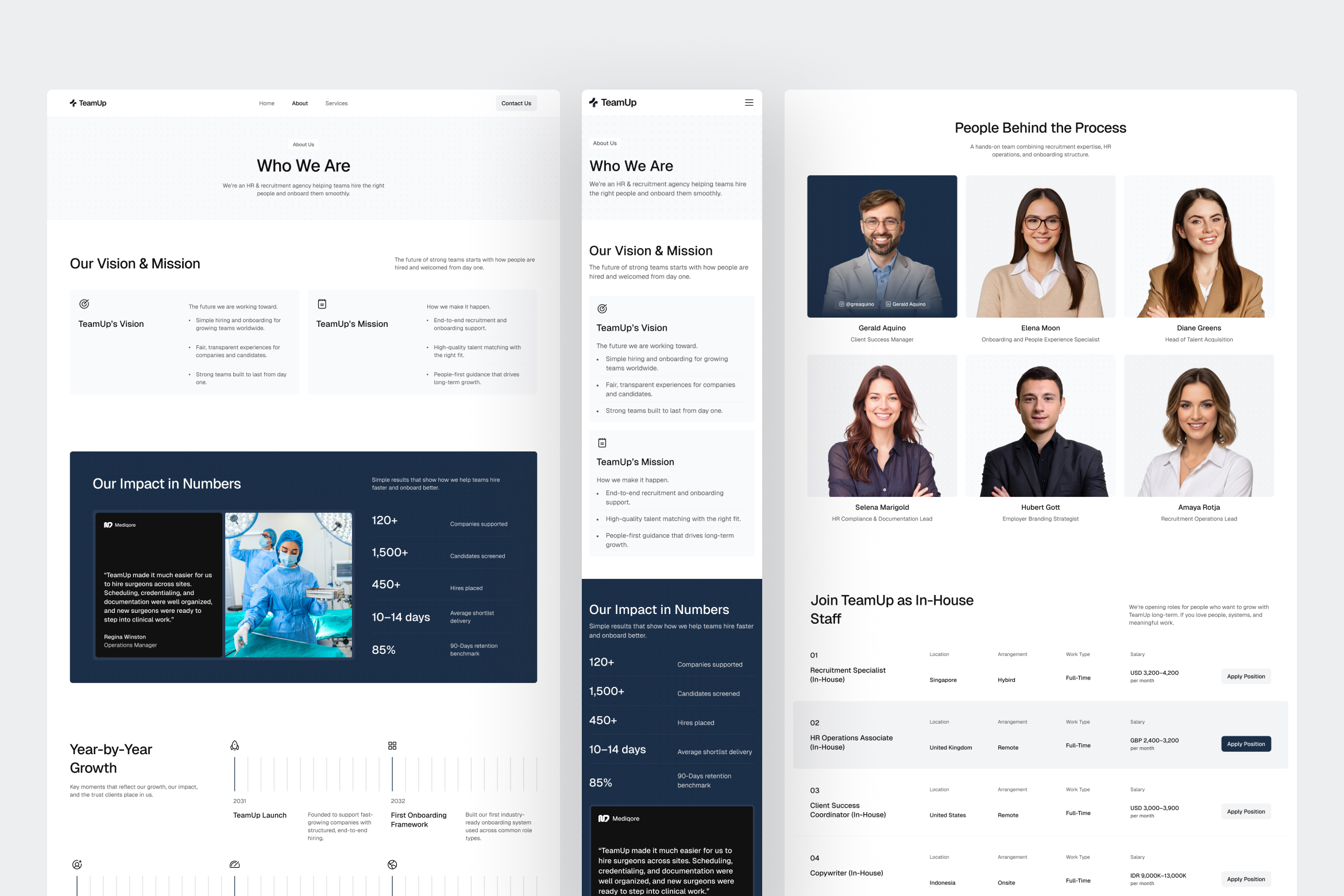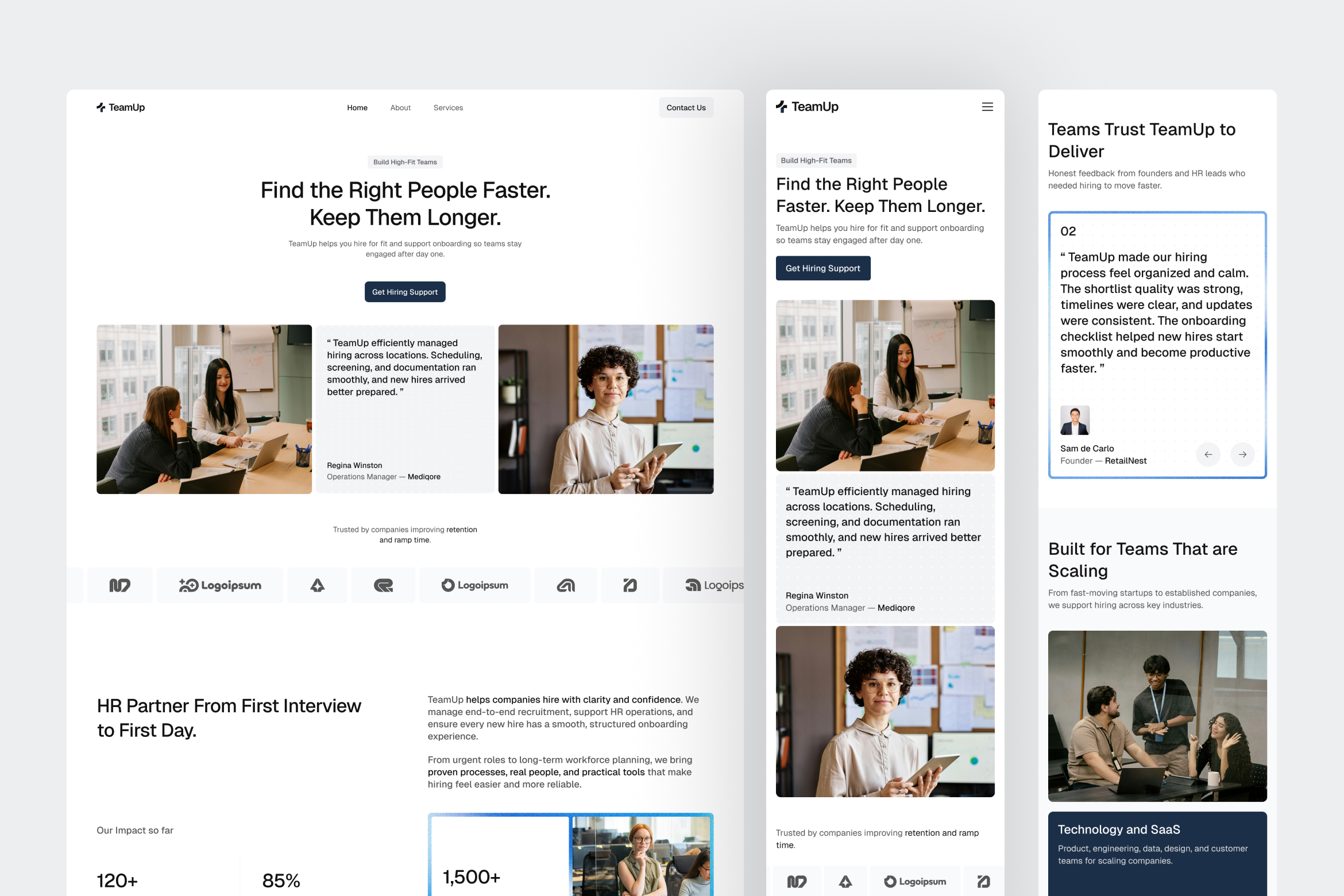 By combining logical content flow, professional visual balance, and strong hierarchy, TeamUp creates a digital environment that reflects how modern recruitment teams operate, clear, structured, and impact-focused. It provides a reliable UI foundation for agencies and hiring partners looking to present expertise with confidence while maintaining a clean, modern brand identity.