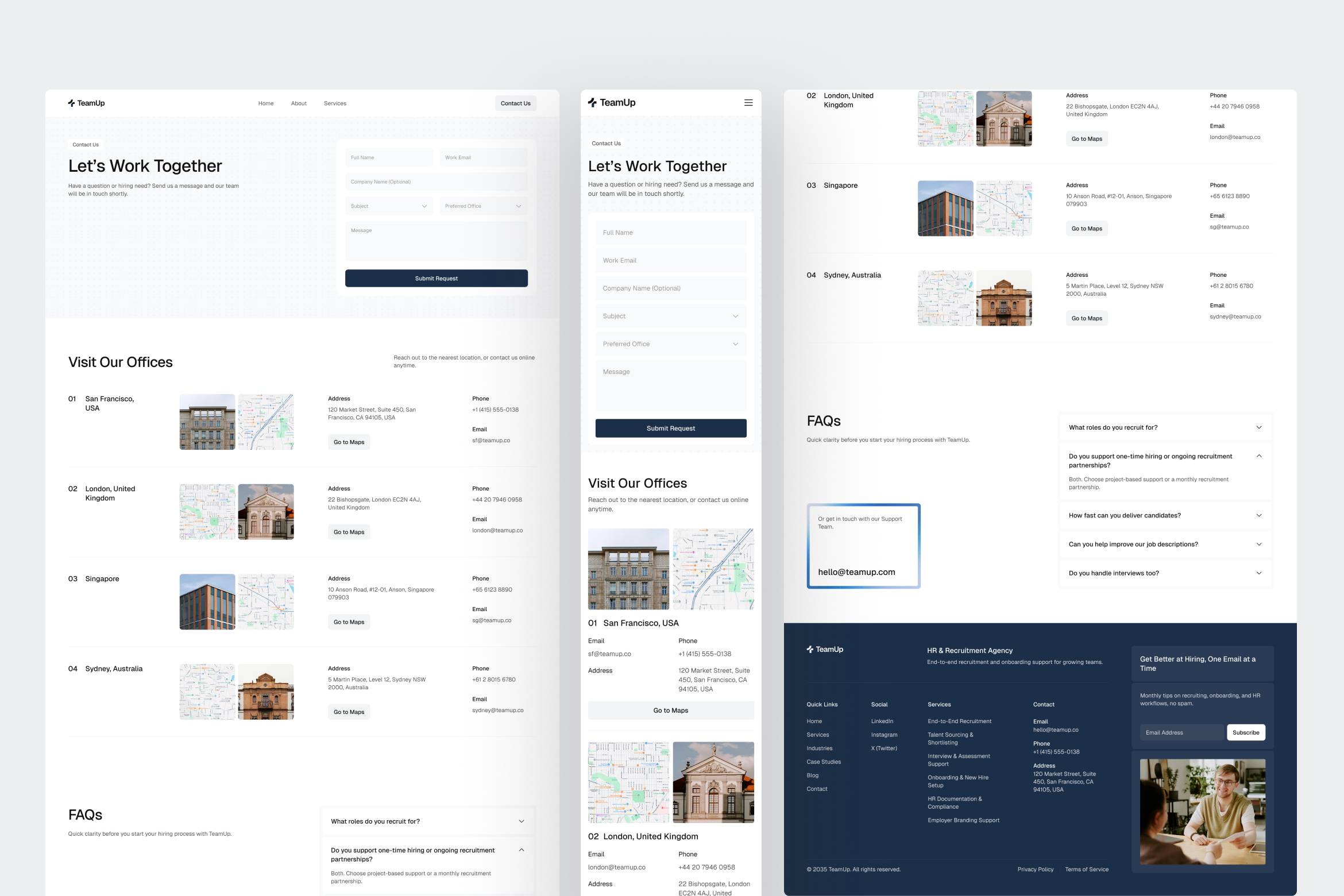 TeamUp is designed to reinforce that perception at every step. The homepage emphasizes clarity in hiring outcomes and service categories. The Services and Service Details pages break down recruitment processes into understandable phases. The About page strengthens credibility through vision, growth milestones, and team transparency. The Contact page simplifies engagement with structured forms and office information.