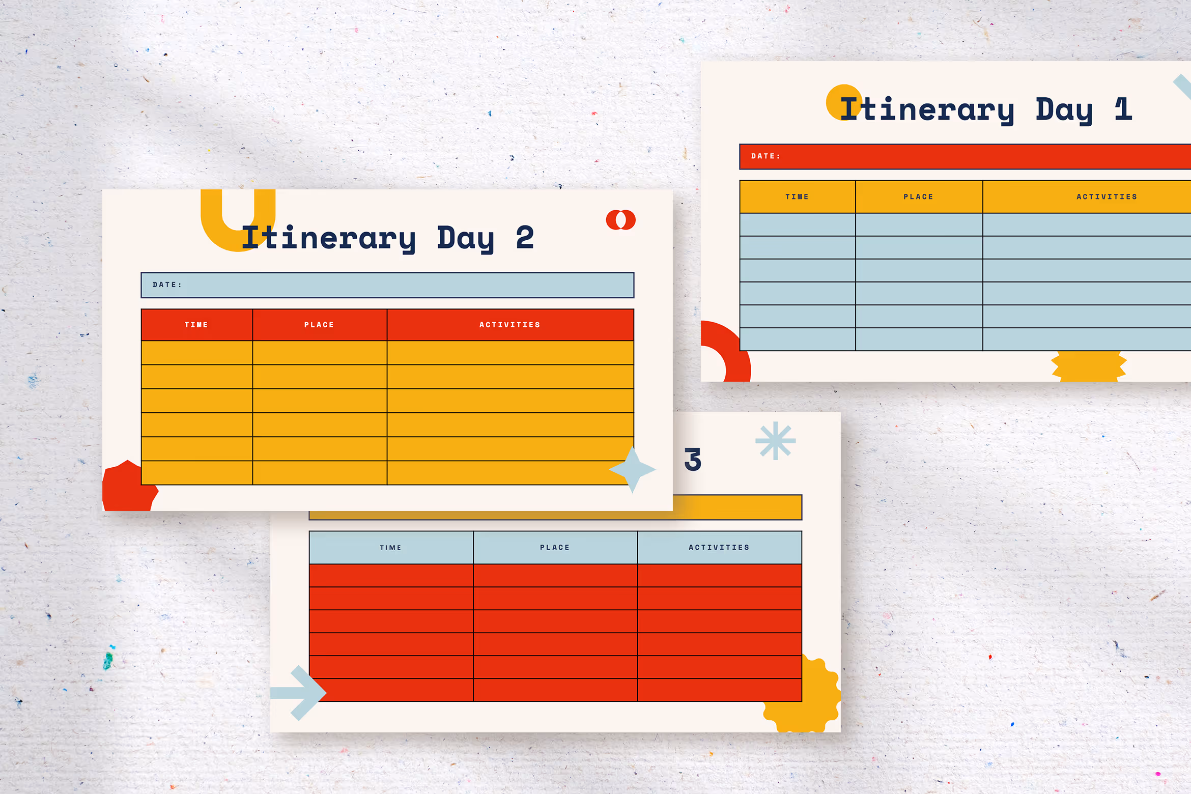 Using an old computer look, you can feel the retro and vintage vibe from this template. Its geometric style with colorful and bright colors creates a fun sensation to show how fun the trip you plan is. Every slide has a well-organized layout so that you can have a neat and clean presentation that is worth presenting. Input your destination, activities, and other travel planner essential in the provided table.