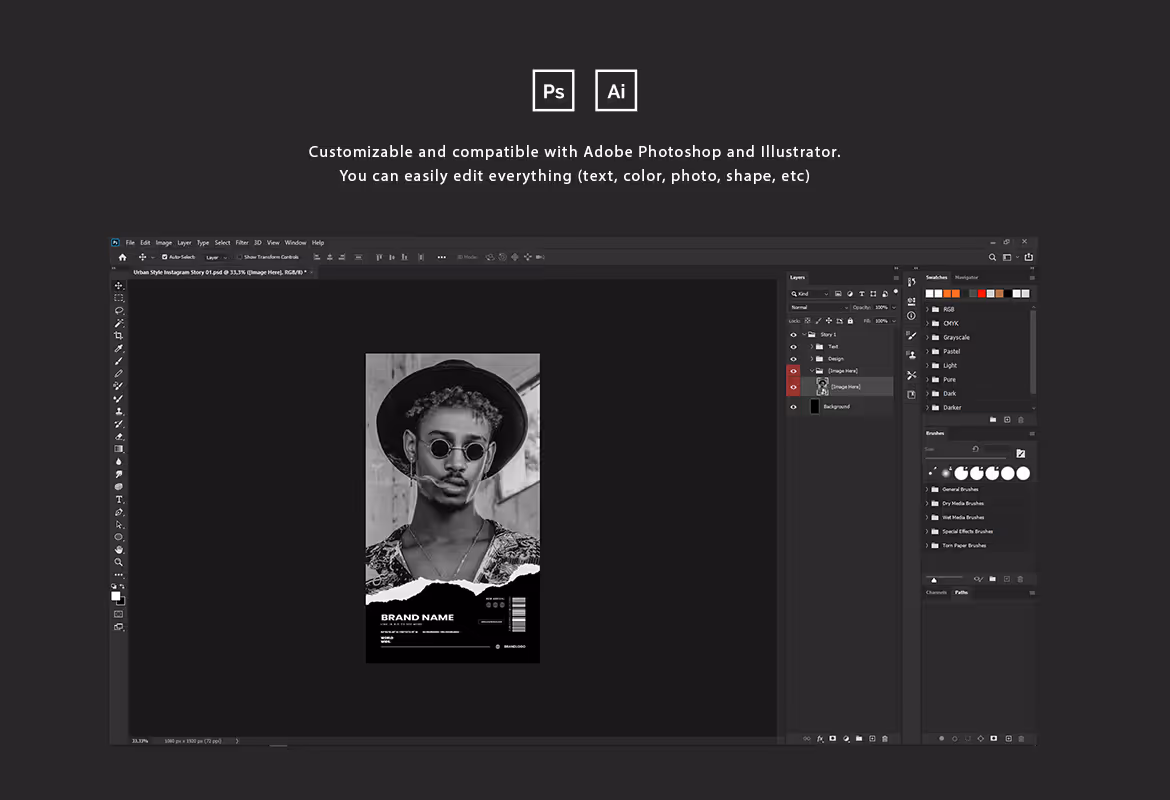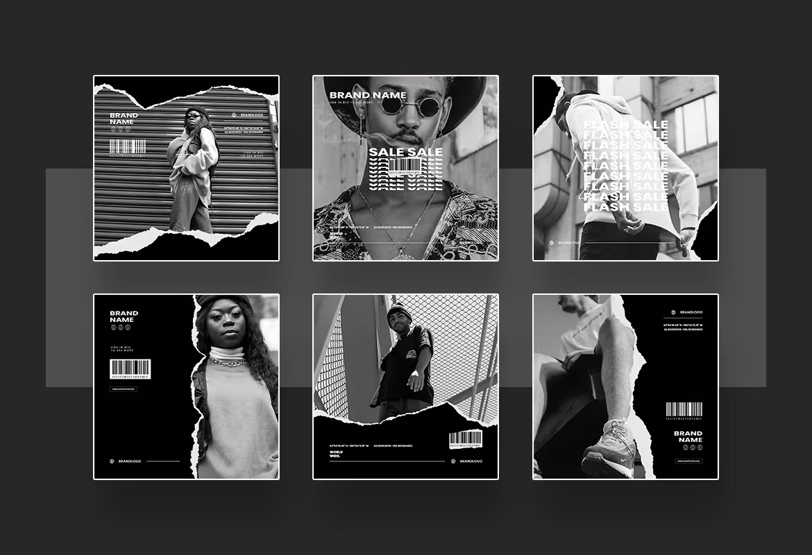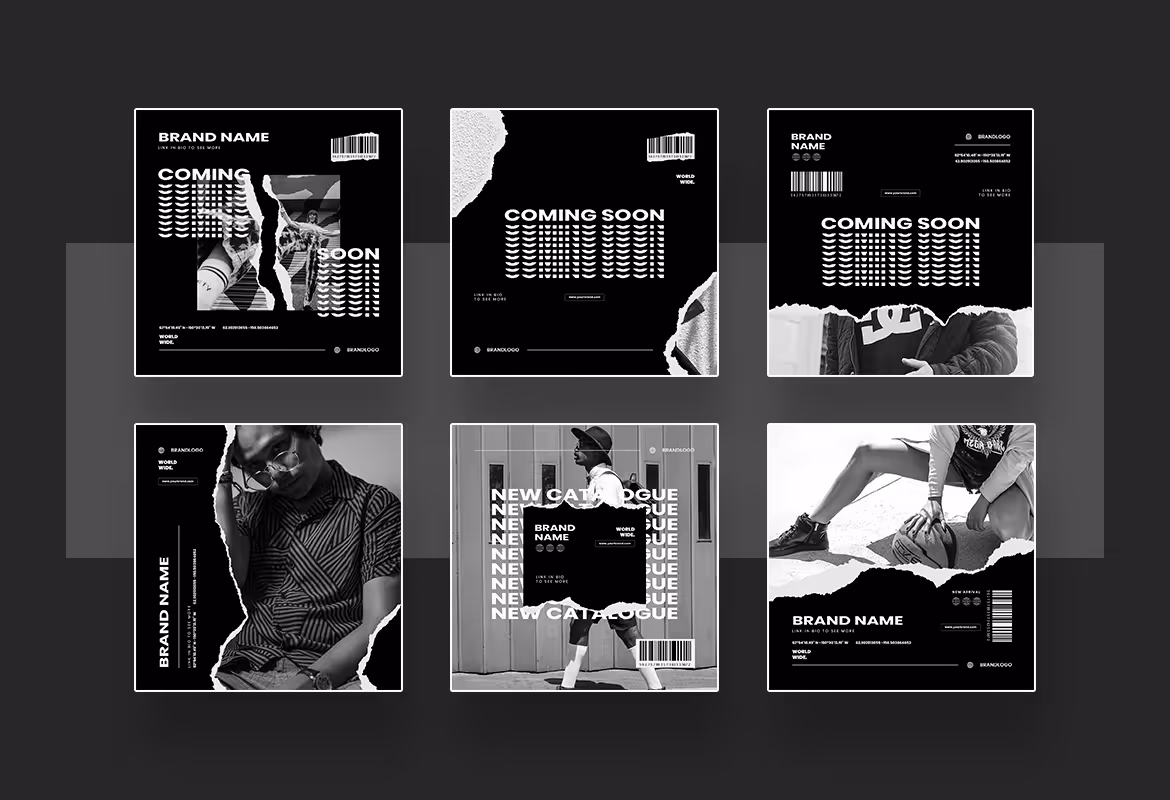 Monochrome Instagram post template with an urban theme. This template is ideal for Fashion Store, Creative Agency, Creative Industry, Creative company, Modern Fashion, Industrial Instagram, Urban Instagram, and any creative theme. Make your Instagram promotion looks stunning and eye-catching using this template. This template includes 24 unique and cool post designs in PSD and AI format. You can edit and customize easily using Adobe Photoshop and Adobe Illustrator.