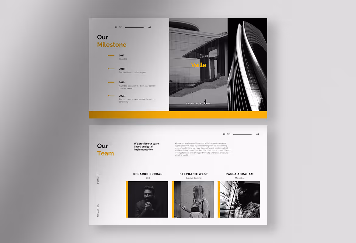 A rapid change in creative industries brings a positive impact to all creative workers. This also causes the competition to be fiercer so that every agency or studio offers the best thing to win the hearts of clients and investors. If you intend not to lose in this competition, you should offer a better presentation of your services, products, even the agency and studio. Introduce your agency or studio using Vaille, a professional creative agency presentation template, to capture the audiences’ hearts. This template is perfect for a business offer, company profile, marketing kit, or any other presentation.