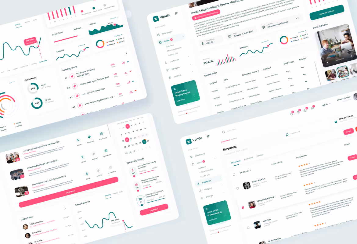 Modern dashboard User Interface design template for an Event ticketing order. This template is ideal for events, ticketing order, concert, ticket booking, and any admin dashboard website. Make your admin dashboard design looks stunning and eye-catching using this template. This template includes 6 unique and modern User Interface screens in PSD and Figma format. You can easily edit and customize using Adobe Photoshop and Figma.