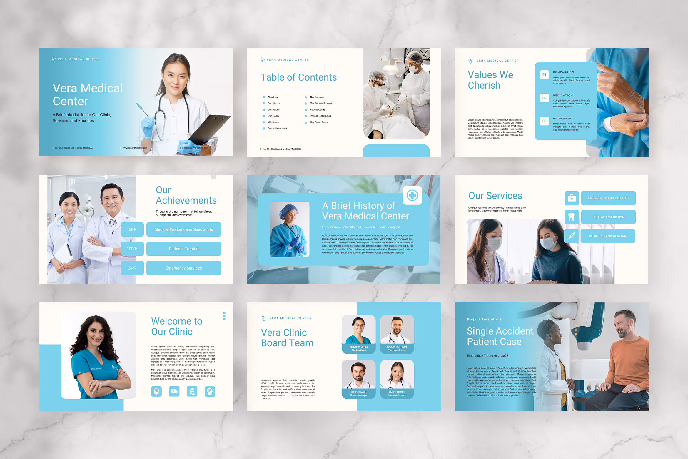 Every business needs a profile presentation, no exception, including a medical clinic. This profile can help your patient or prospective investor to learn more about the clinic you have. Providing a decent profile presentation can increase their trust in your services and responsibility. You should show these values on your presentation template or design because it will help you gain their concern. Vera, the clear blue sky minimalist medical clinic profile presentation template, will help you make one. This template is perfect for clinics, hospitals, or other healthcare centers.