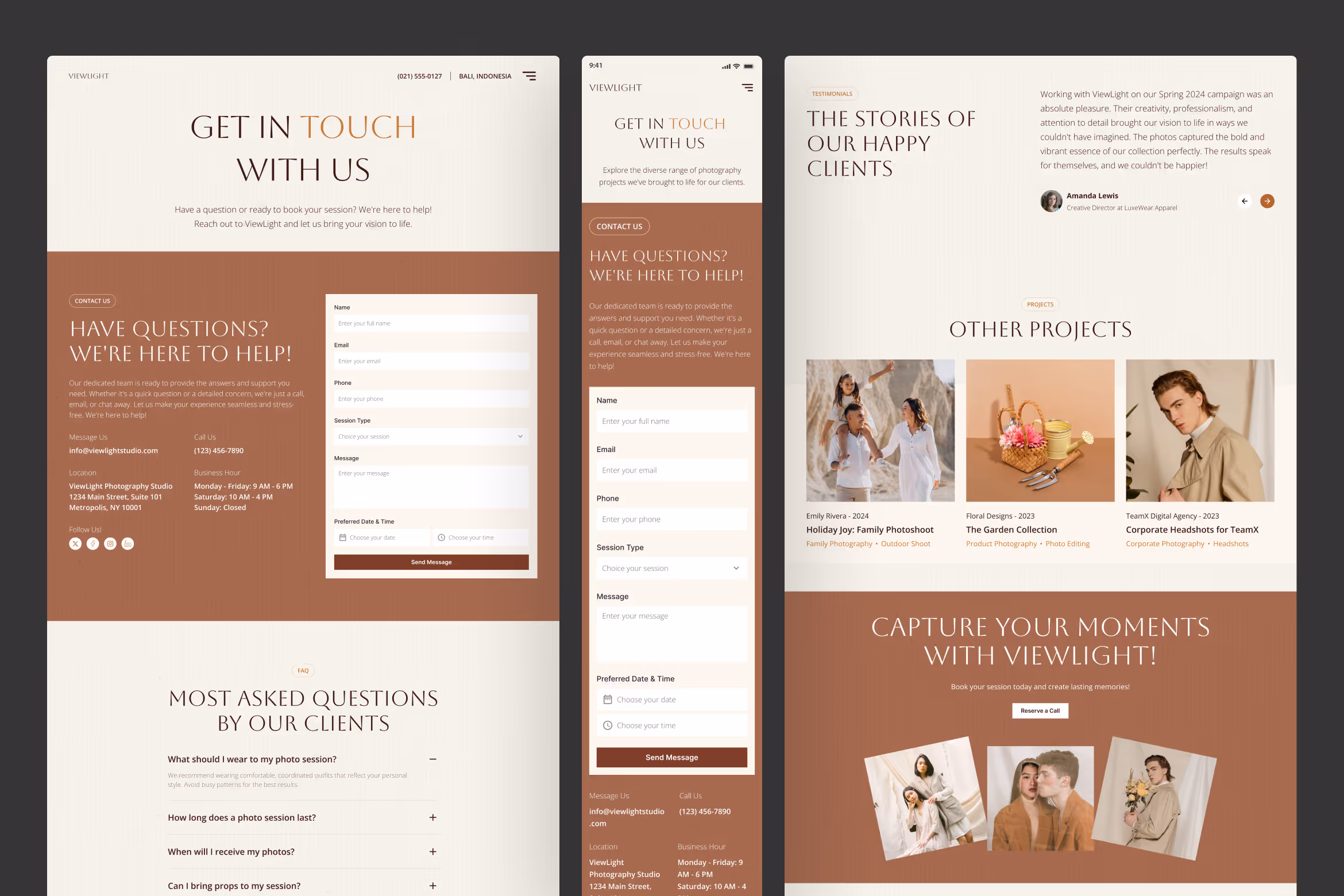 Elevate your photography business with Viewlight, a photo studio website UI Figma template. Designed to impress and convert, this template offers a modern and inviting layout that caters to desktop and mobile versions, ensuring a seamless user experience across all devices. The clean, structured design emphasizes functionality and elegance, guiding visitors effortlessly through your website pages. The warm earthy tones and crisp white spaces create a sophisticated, timeless aesthetic that perfectly complements photography-based businesses.