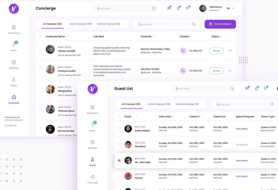 Modern dashboard User Interface design template for a Hotel booking dashboard. This template is ideal for reservation, hotel admin, booking room, booking house, house rental, and any admin dashboard website. Make your admin dashboard design looks stunning and eye-catching using this template. This template includes 6 unique and modern User Interface screens in PSD and Figma format. You can easily edit and customize using Adobe Photoshop and Figma.