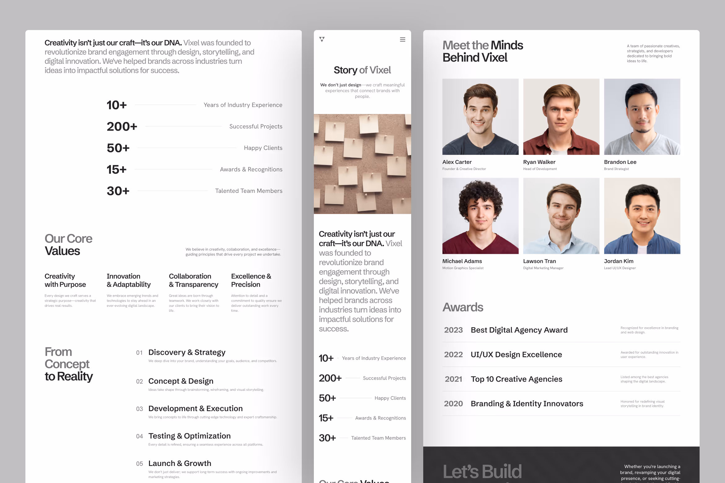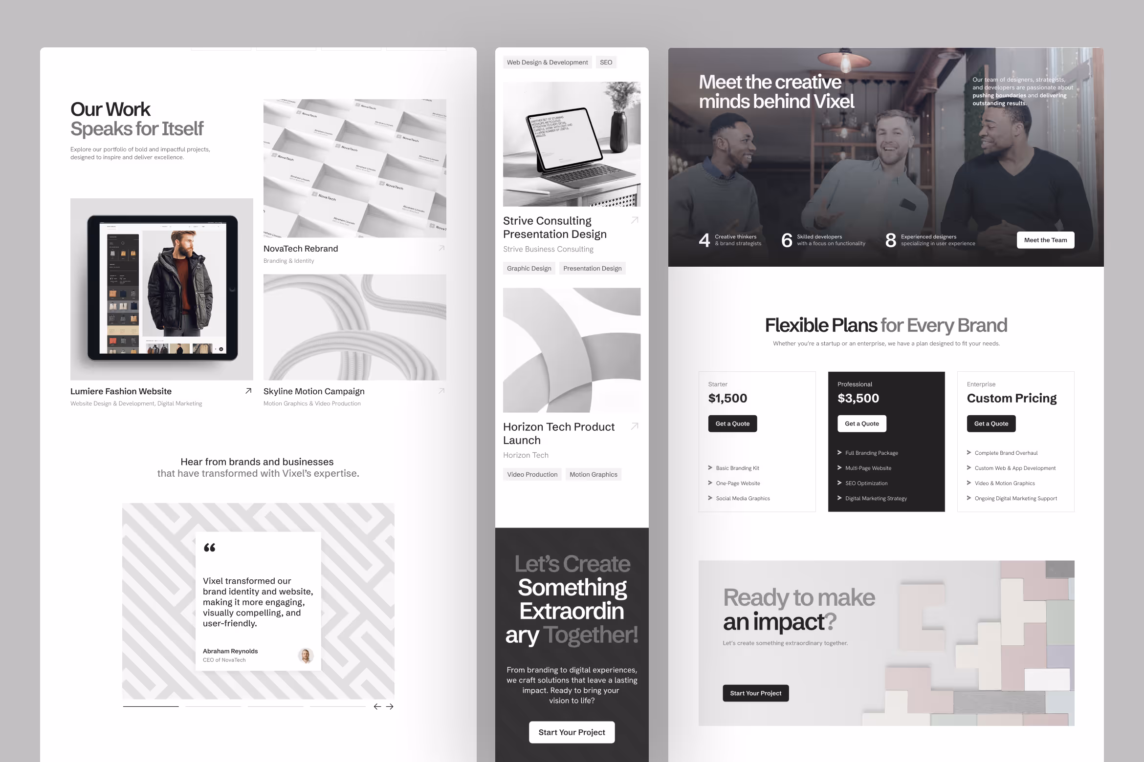 This template combines minimalist design with a clean and structured grid-based layout, featuring a monochrome color scheme with subtle accents. Fully responsive on desktop and mobile, it ensures a seamless browsing experience across all devices. With five essential pages, Vixel provides a perfect platform to showcase your agency’s services, portfolio, and expertise.