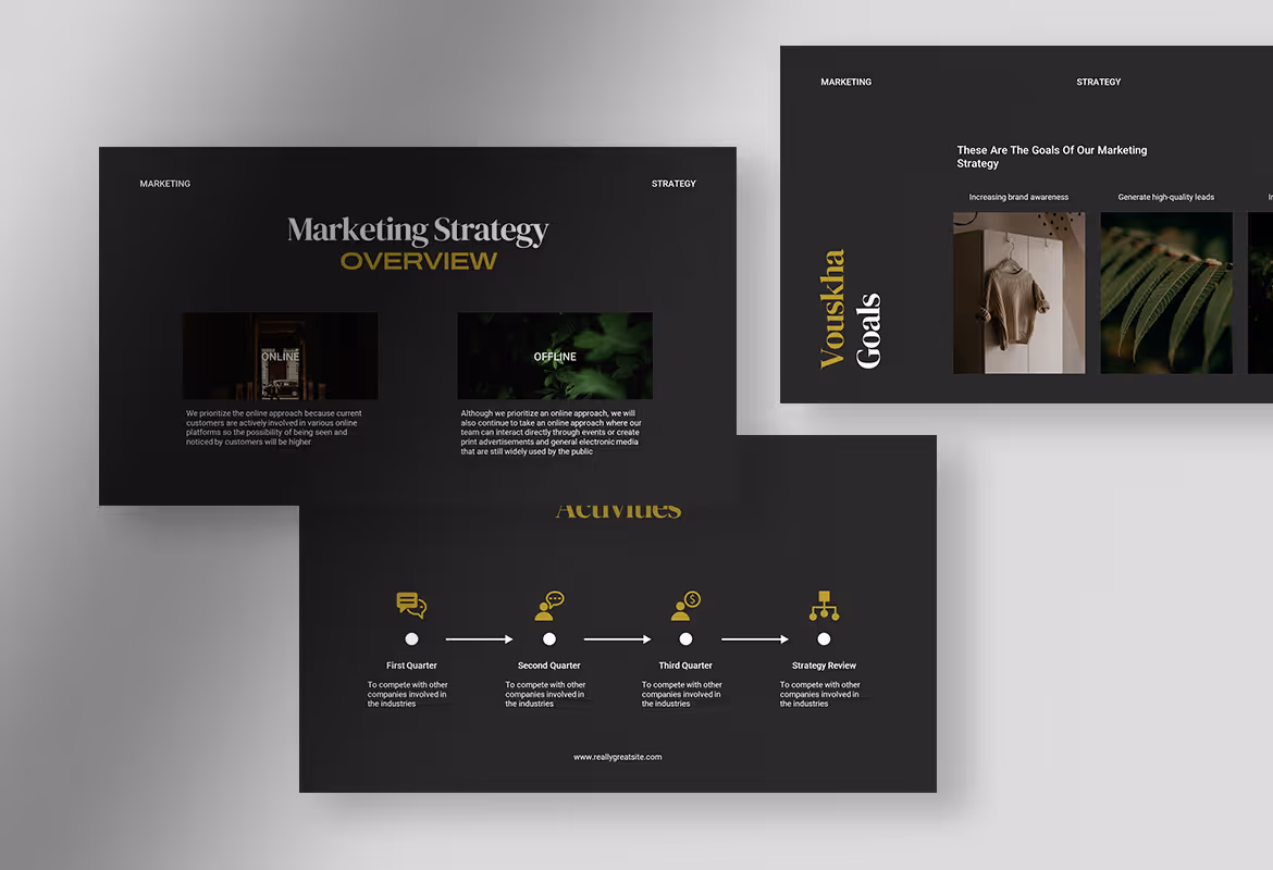 To increase sales in your business, marketing strategies must be updated with the times and adjusted to the products or services to be sold or offered. Before implementing those strategies in the field, present them before your teammates and superiors for approval. Increase your marketing strategy approval rating using Vouskha, a bold professional marketing strategy presentation template that can help you make an outstanding presentation. It is perfect for your company, corporate, start-up, professional, entrepreneur, and other businesses.
