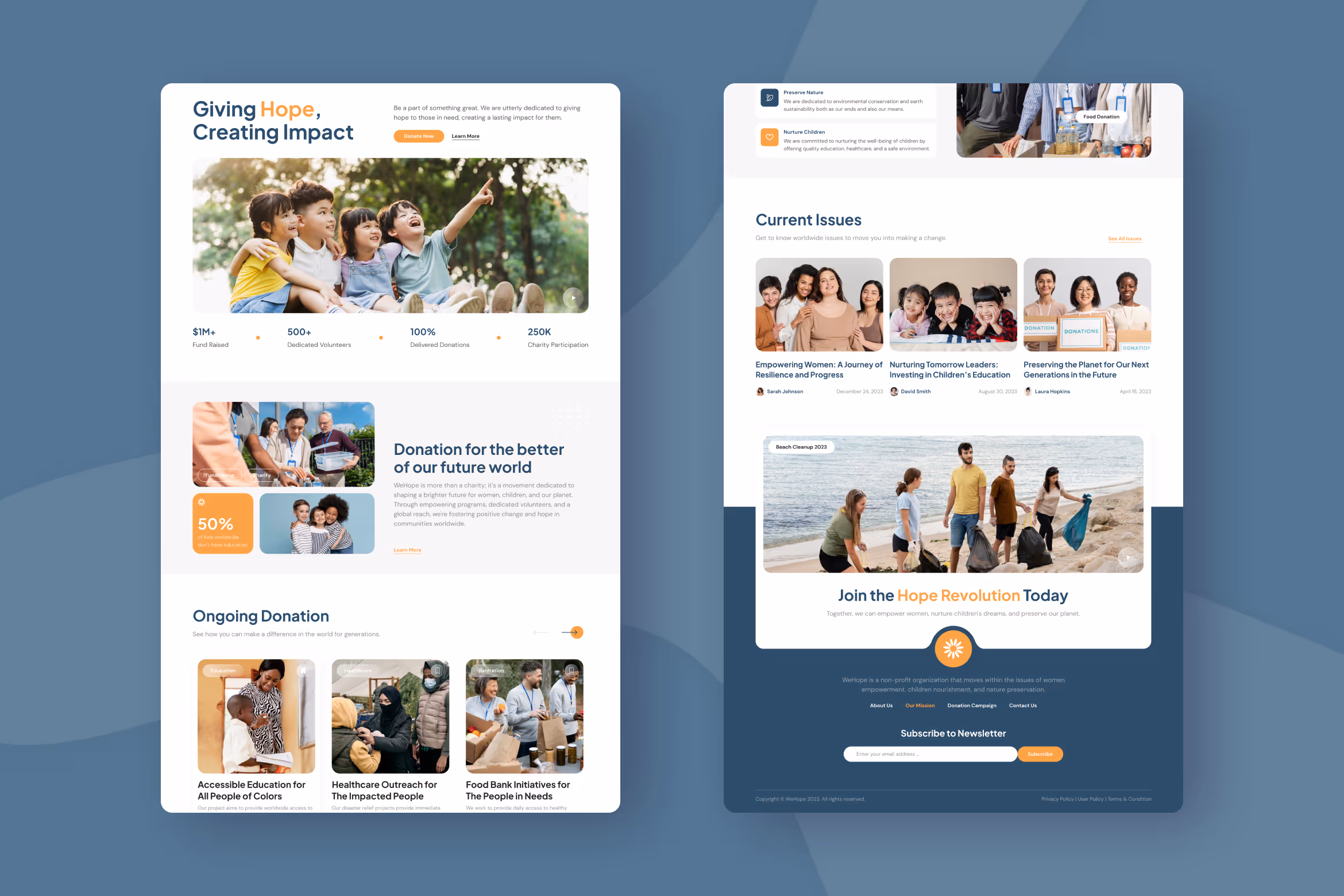 Invite more people to join your campaigns and causes using WeHope, a clean and modern non-profit charity landing page Figma template. It has a clean look and neat layout, allowing any user to explore the page comfortably. This template is perfect for a charity foundation to share the goodness with more people.