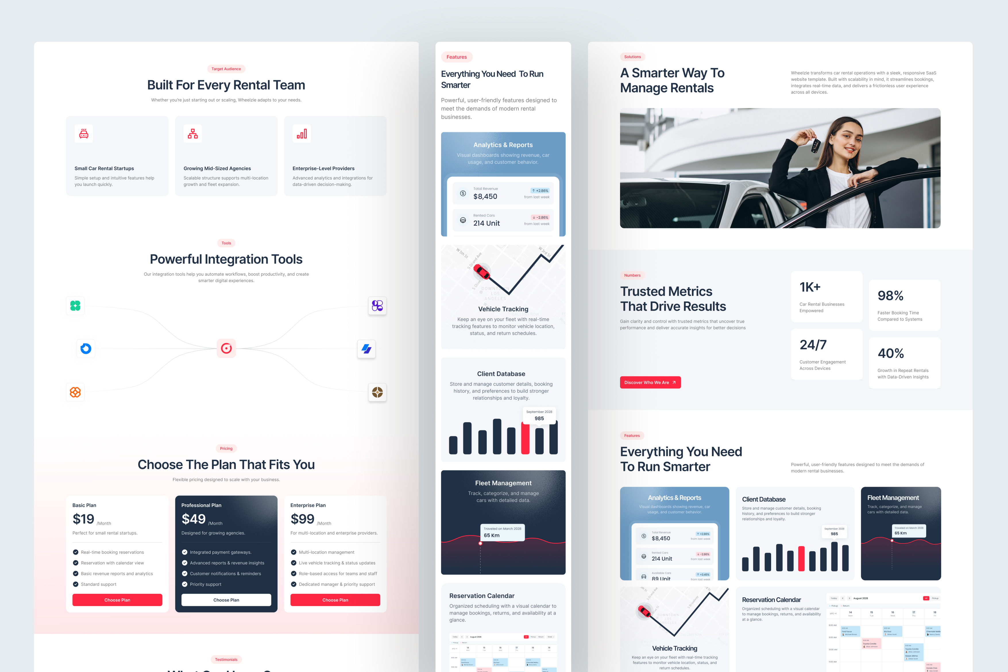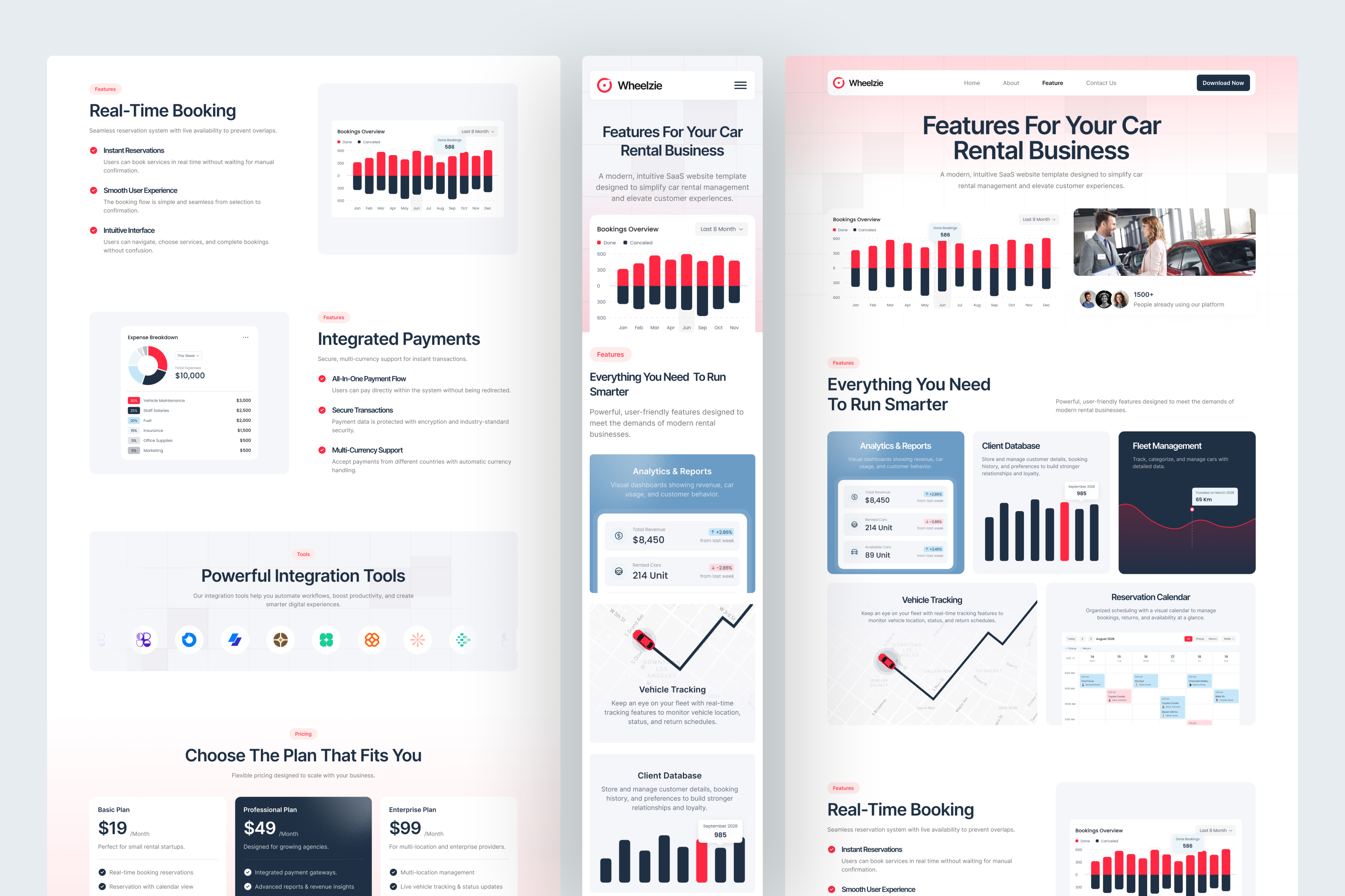 Every page is thoughtfully designed to communicate reliability: from real-time booking visuals and performance metrics to global operations, customer stories, and clear service explanations. Whether you’re showcasing a SaaS platform, creating a rental service MVP, or building a dashboard companion website, Wheelzie offers the perfect foundation to communicate innovation, professionalism, and smooth rental operations.