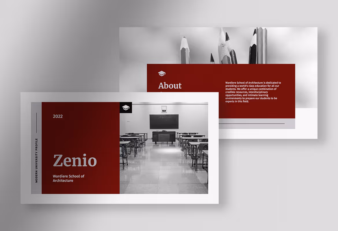 University and school is the representation of civilization and education. Hence, in making a school or university presentation, you have to make sure the template used can represent the values that your institution holds. You must also be able to show a vision of the future of your educational institution that wants to bring progress. For you who need a modern and professional education presentation, we gladly offer you our latest template design Zenio, the grayscale maroon modern education presentation template. This template is perfect for any educational institution, especially universities, colleges, vocational schools, and more.