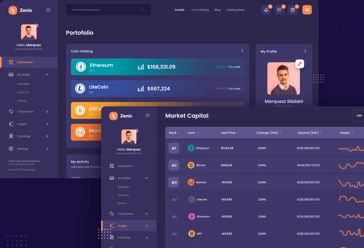 Modern dashboard User Interface design template for a Cryptocurrency manager. This template is ideal for crypto trading, crypto transaction, crypto admin, bitcoin trading, ethereum trading, crypto wallet, analytics, crypto market, and any admin dashboard website. Make your admin dashboard design looks stunning and eye-catching using this template. This template includes 6 unique and modern User Interface screens in PSD and Figma format. You can easily edit and customize using Adobe Photoshop and Figma.