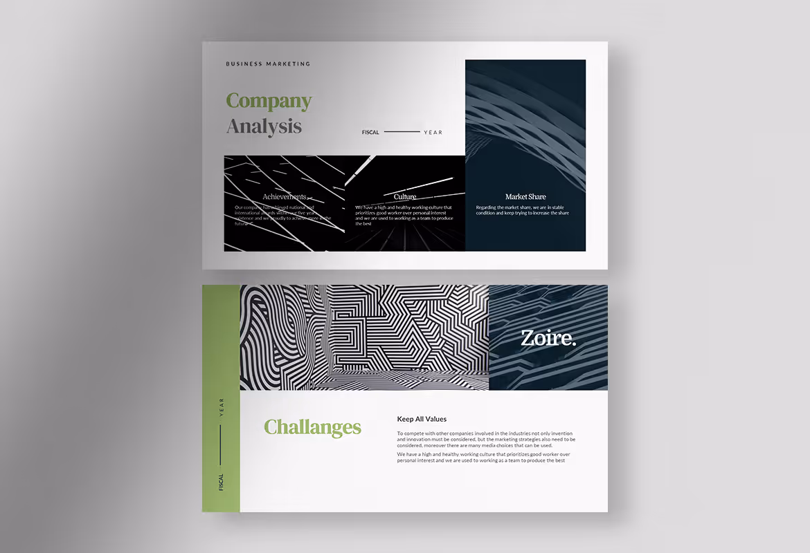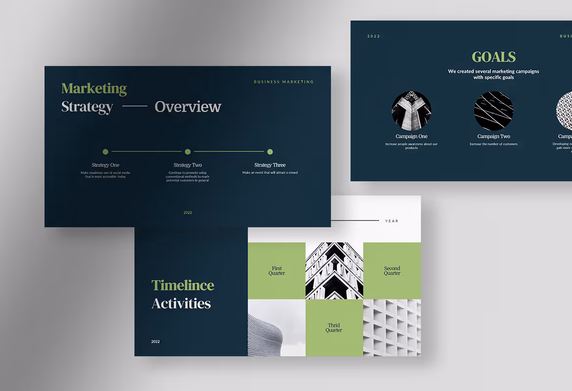 This template provides ten editable layouts with a professional and unique design. Thoroughly distribute your objectives, goals, timeline, financial projections, and so on to the audience. Get a deep and serene atmosphere with architectural patterns, white background, plus dark teal blue and green accent. This template will be compatible the most with architecture or real estate companies. However, its customizable feature could make it more fluid.